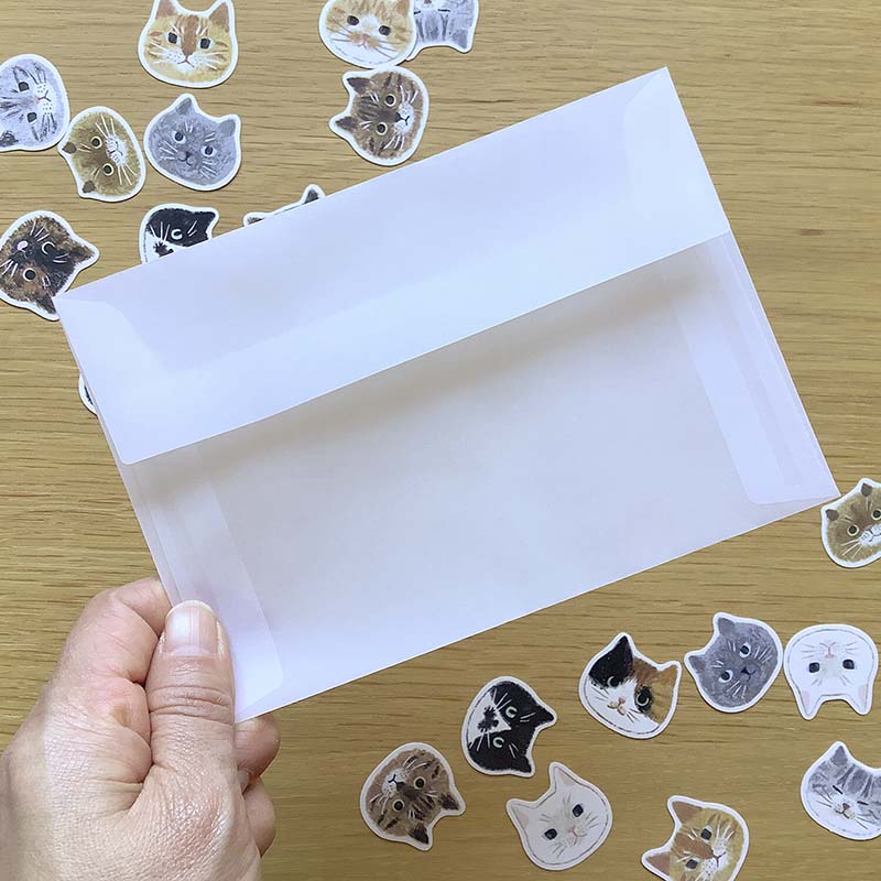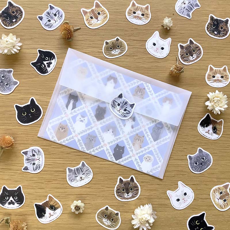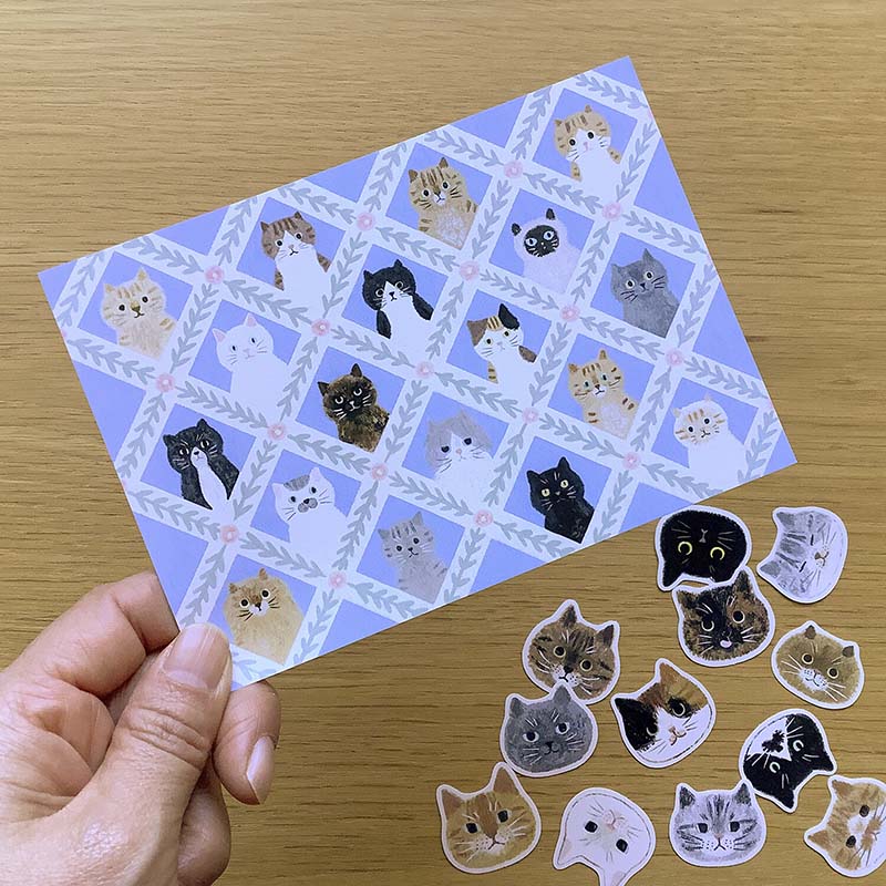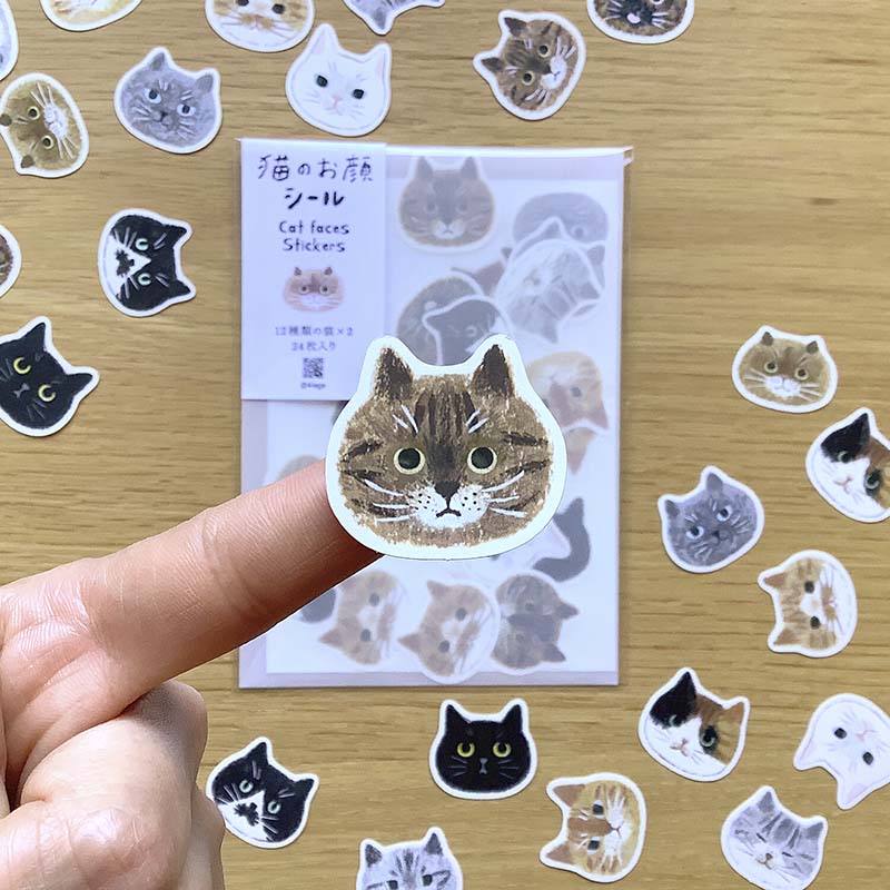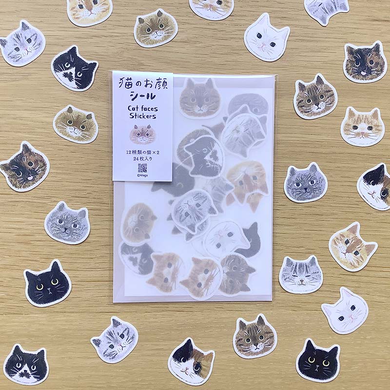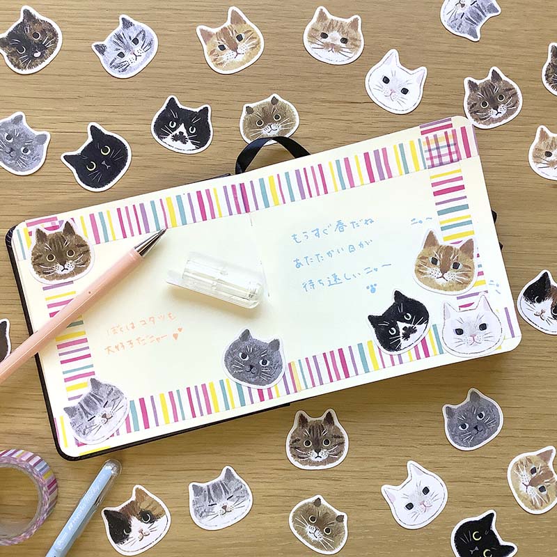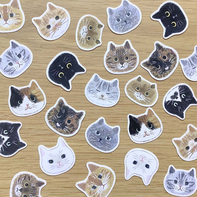 - Pegatinas decorativas recortadas con estampado y forma de caras de gatos.