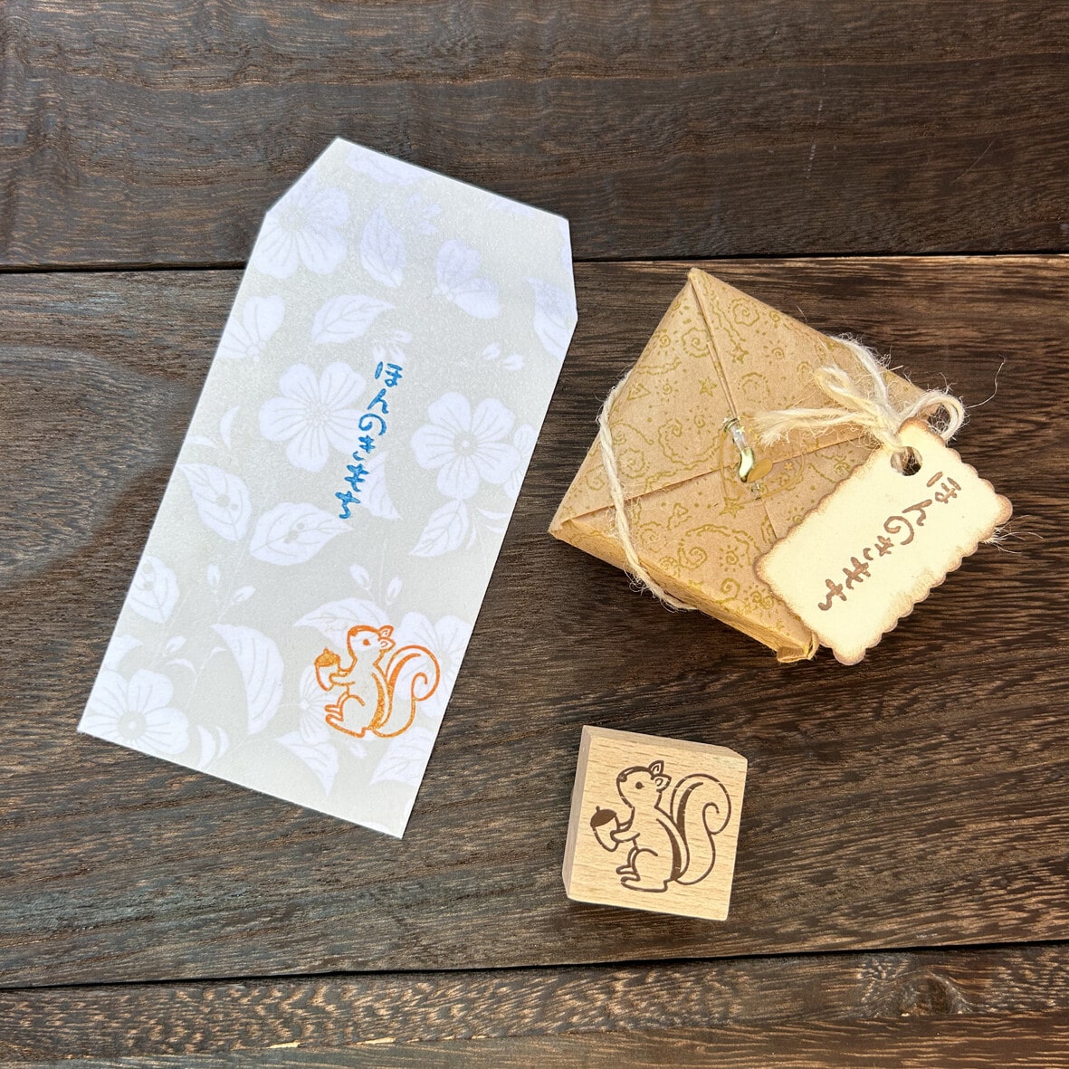 - Rubber stamp with a wooden base and a squirrel print.