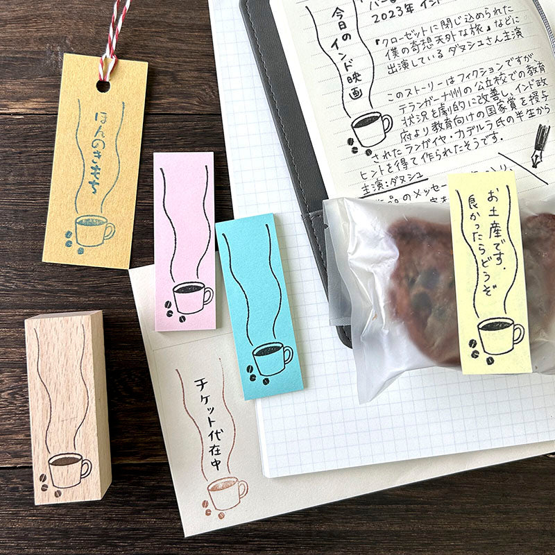 - Sello de goma con la base de madera con estampado de un café humeante.