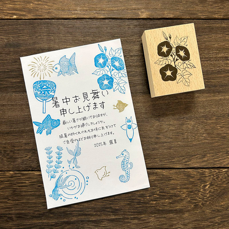 - Sello de goma con la base de madera con estampado de flores de campanilla.