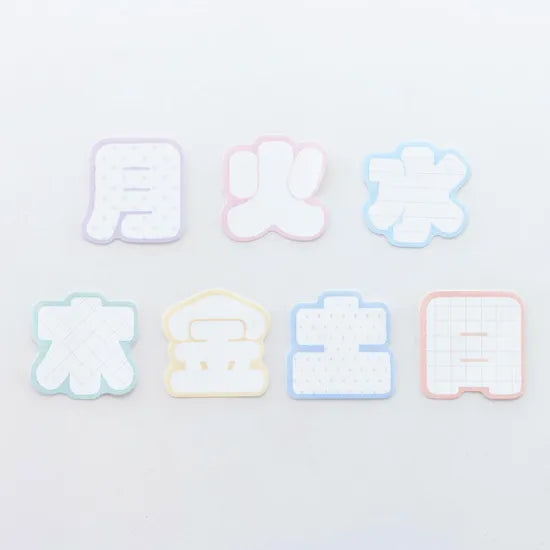 - Pegatinas individuales en formato rollo con estampados de los carácteres de los días de la semana en japonés.