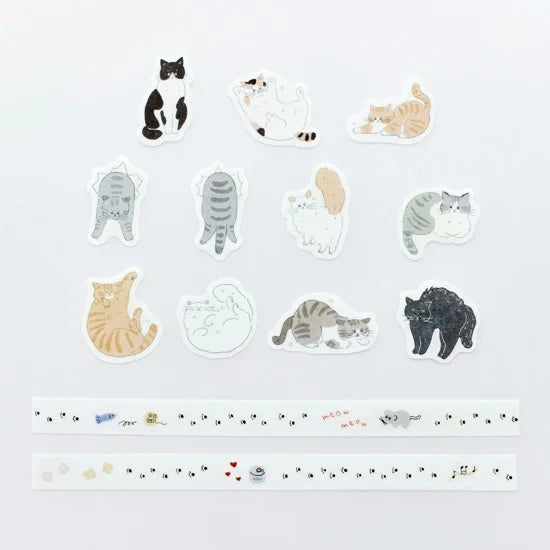 - Set of individual stickers in roll format with a cat print and a decorative Washi Tape strip.