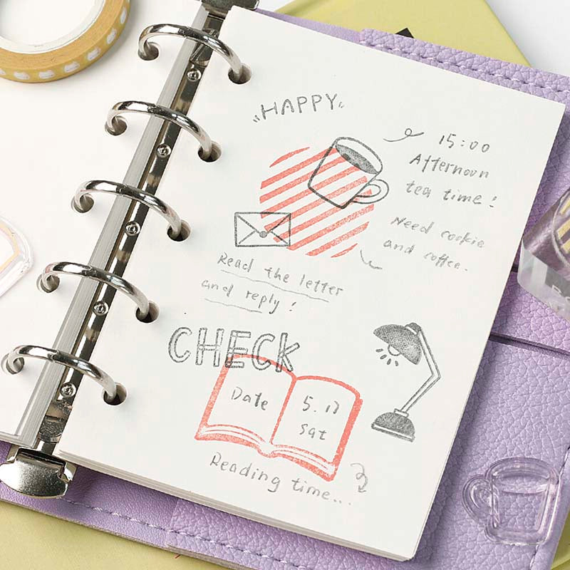 - Set de sellos de silicona con estampados de papelería y journaling.