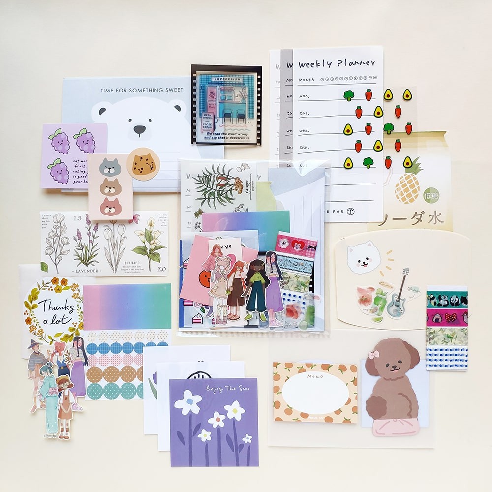 - Includes stickers, washi tape samples, sticky notes, labels, patterned papers, etc.