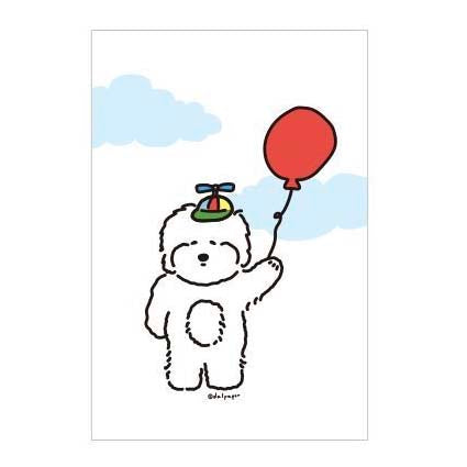 - Postal con ilustración de un perrito Maltés con globos.