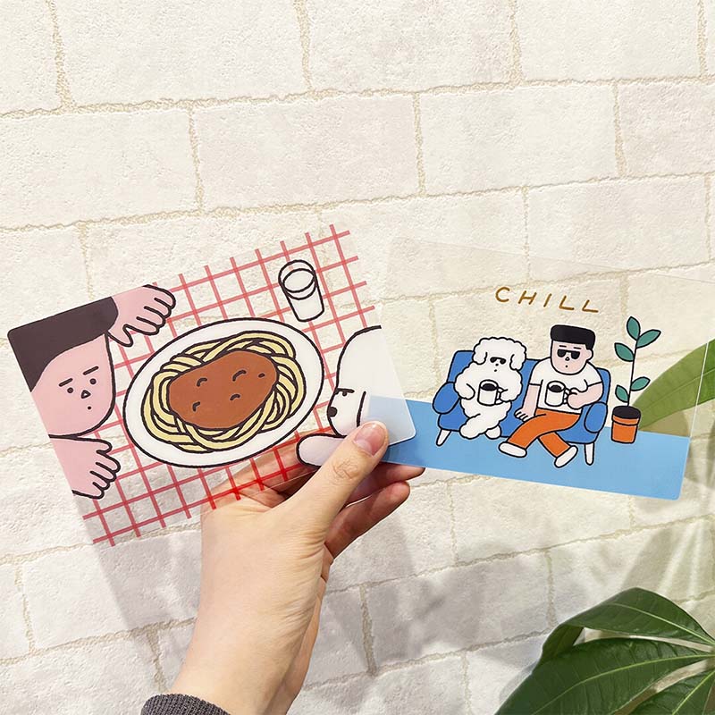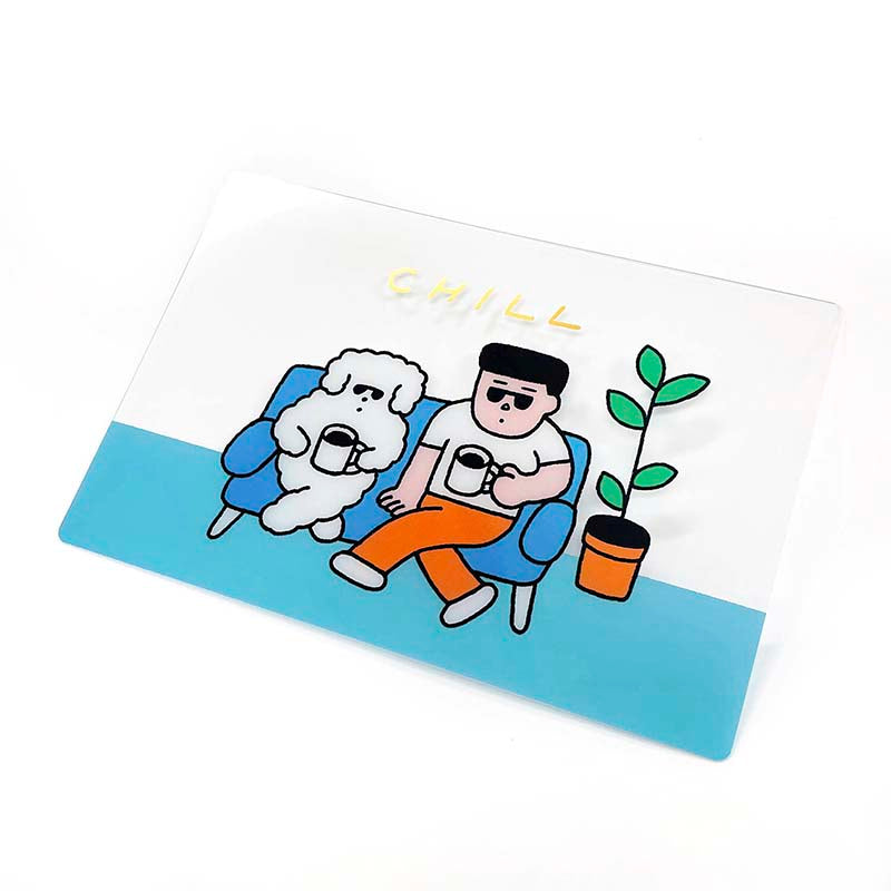 - Postal de material plástico con ilustración de una persona y un perro tomando café.