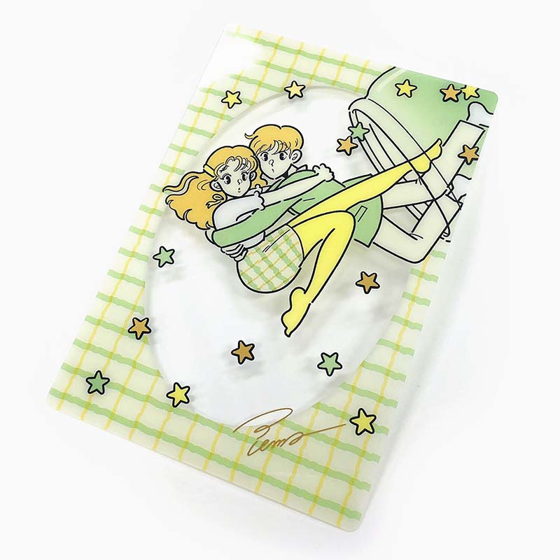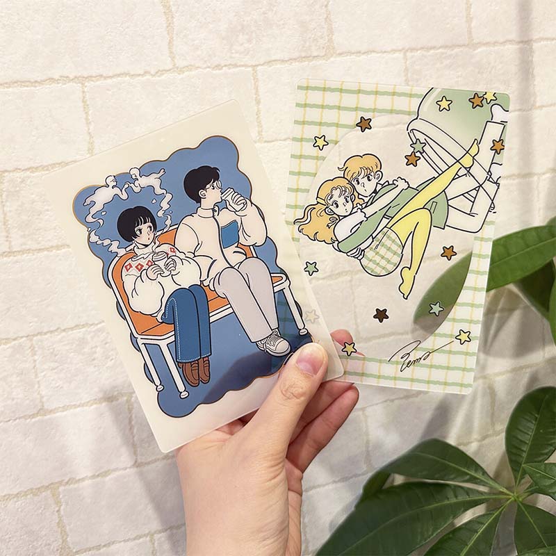 - Postal de material plástico con ilustración de dos personas abrazadas.