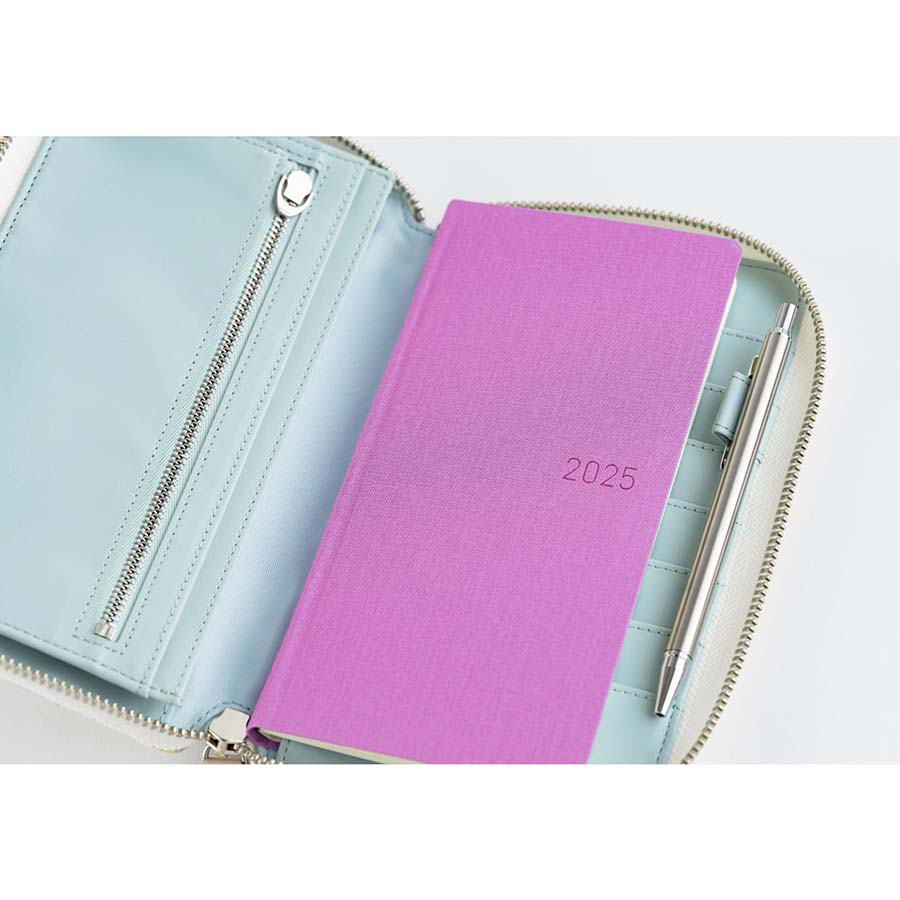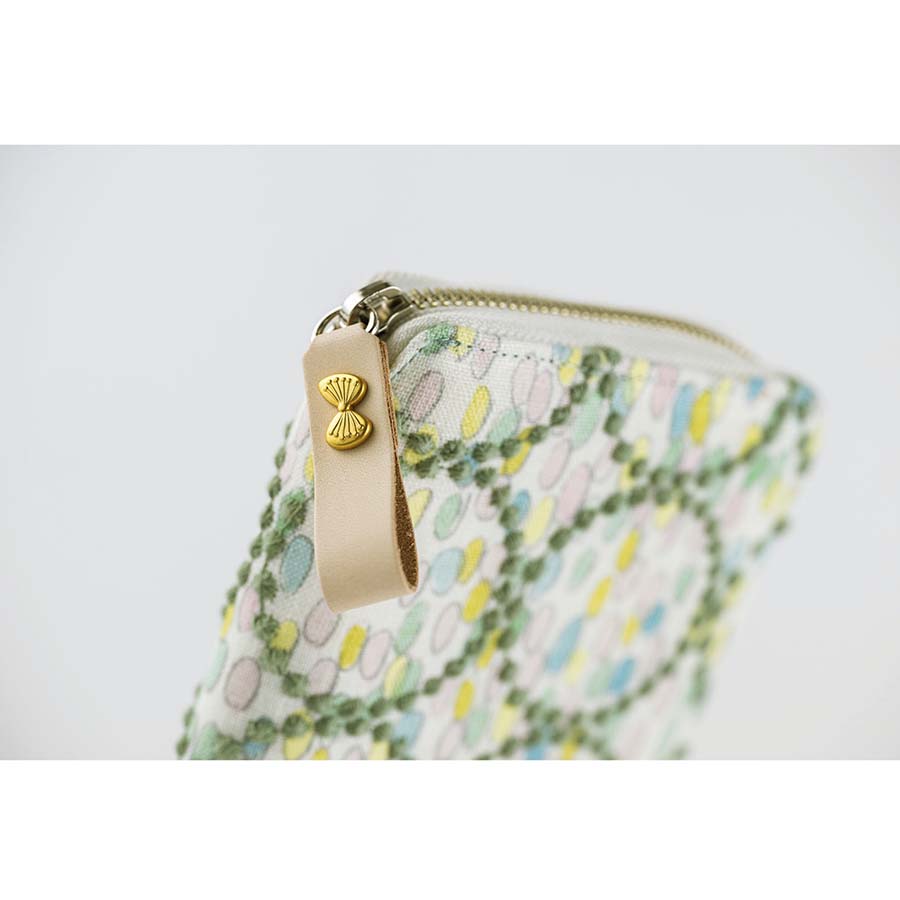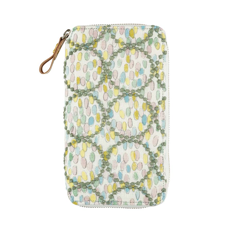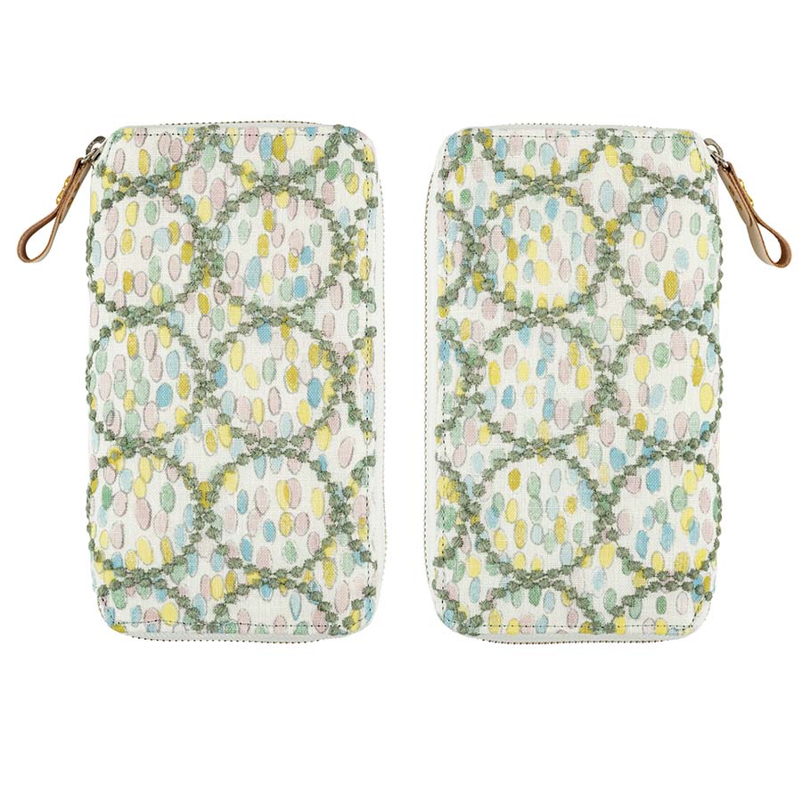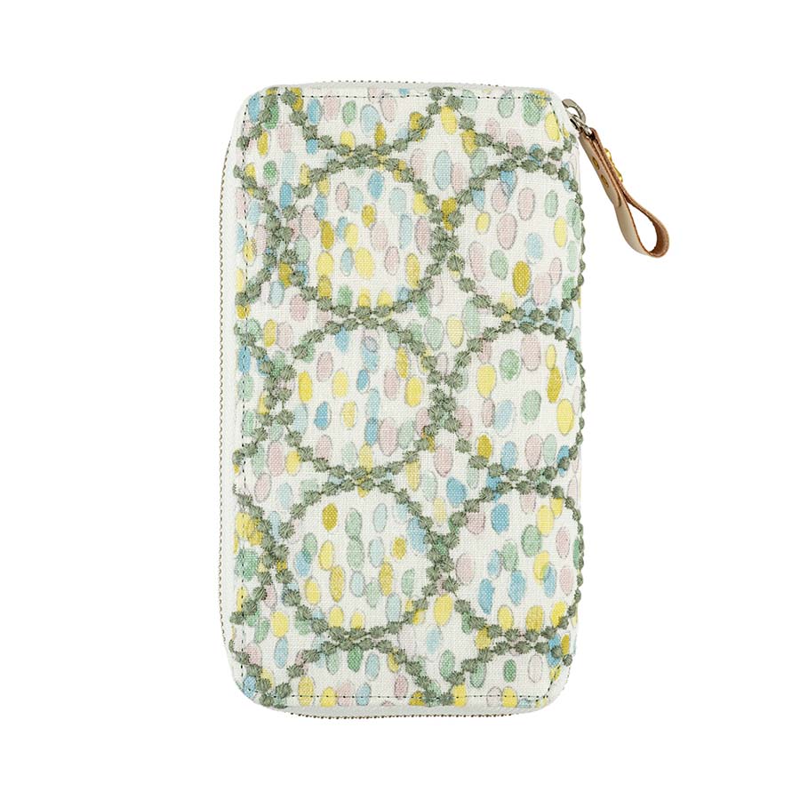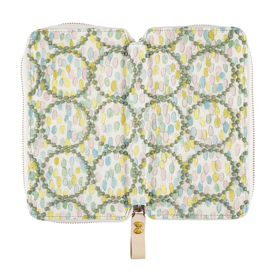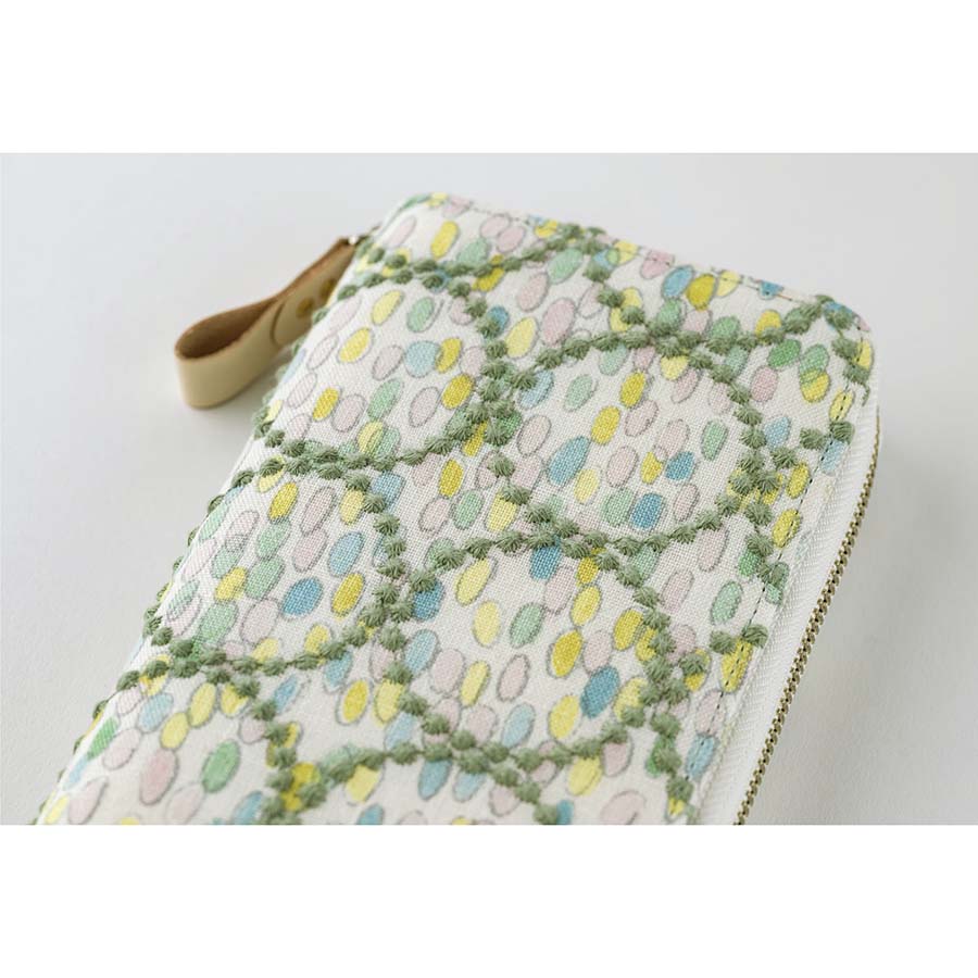 - We created a cover using two fabrics: “jelly beans,” which once appeared in the Hobonichi Techo line, and “tambourine,” which has been popular with many. This fun design features two “circle” shapes that playfully overlap: the fluffy sweet looking watercolor drops and embroidered dotted circles.