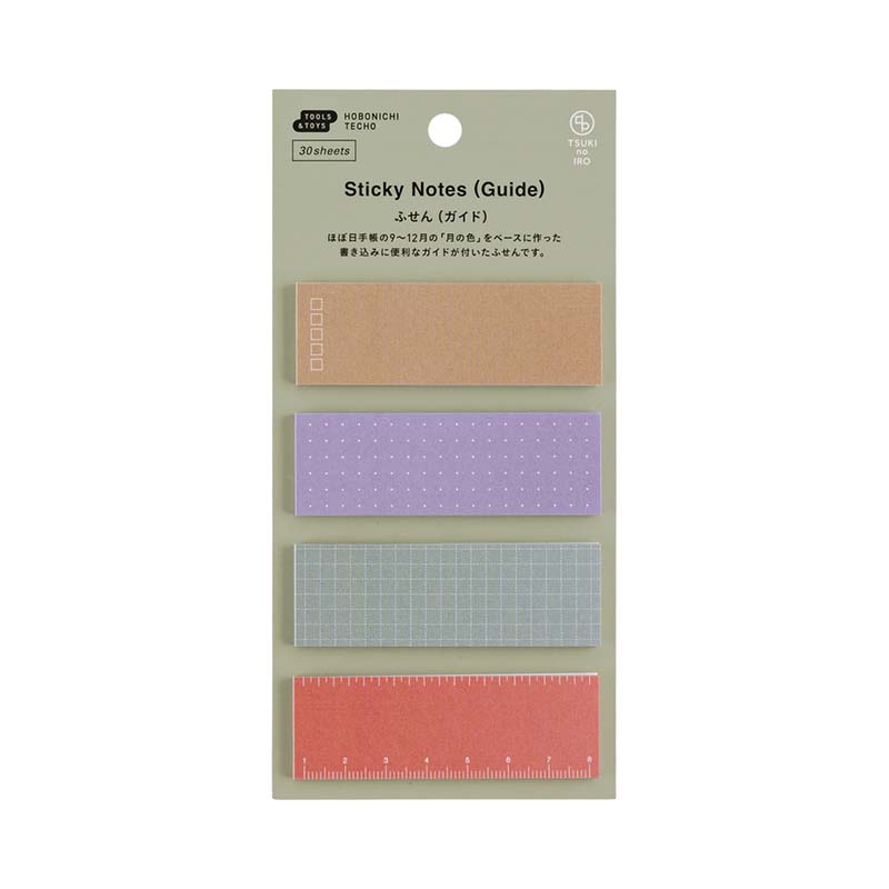 - Notas adhesivas que incluye diseños funcionales con guías de escritura integradas, inspirados en los colores mensuales de septiembre a diciembre de las agendas Hobonichi.