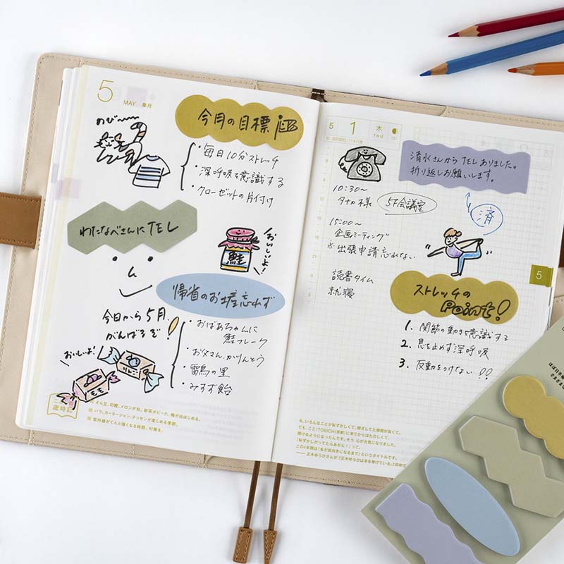 - Notas adhesivas que se basan en los colores mensuales de mayo a agosto del Hobonichi Techo. Estas notas adhesivas troqueladas tienen formas divertidas y variadas, por lo que son ideales para decorar tus páginas, combinarlas con otras notas o crear collages.
