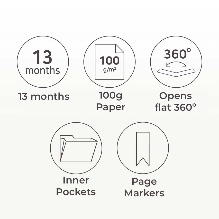 - Encuadernación cosida que permite que la agenda se abra 360 grados con facilidad.