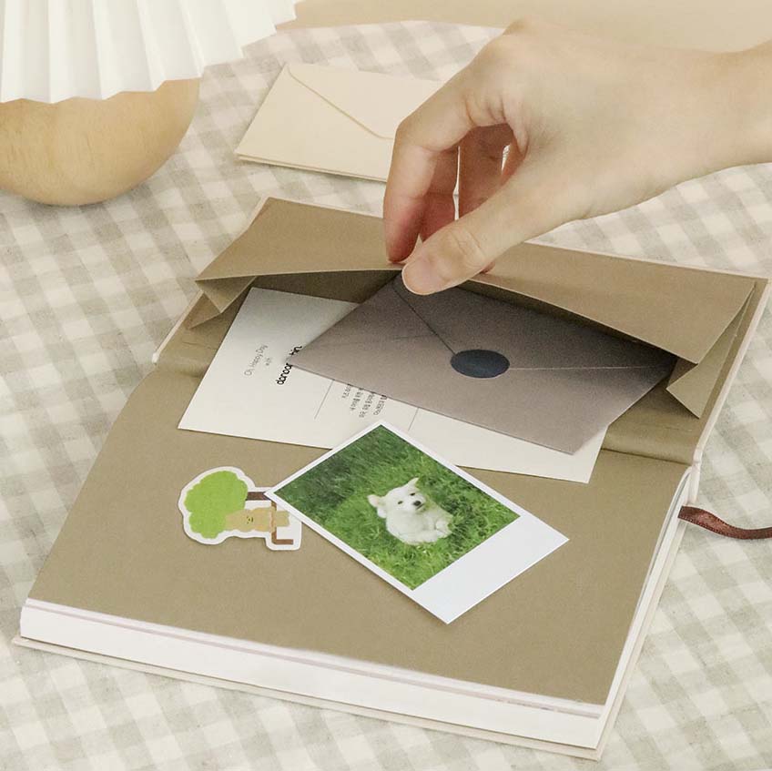- Tapa dura con un sobre interior para guardar papeles y recortes.
