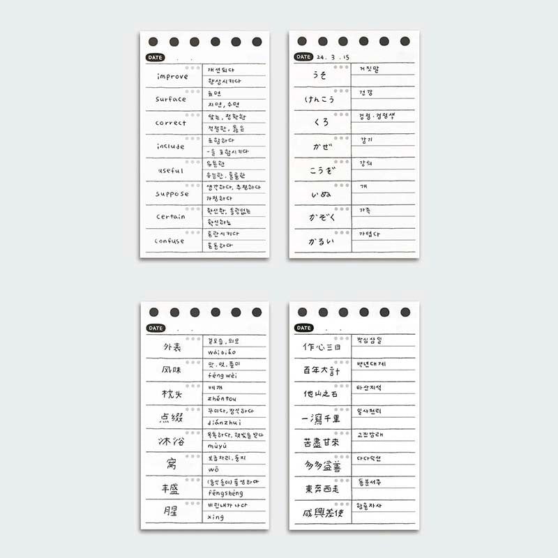 - 80 sheets of the same design on both sides with 8 words per page for a total of 1,280 words to memorize.