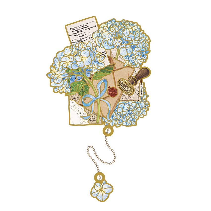 - Marcapáginas metálico con forma y estampado de flores y cartas postales.
