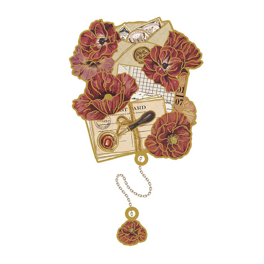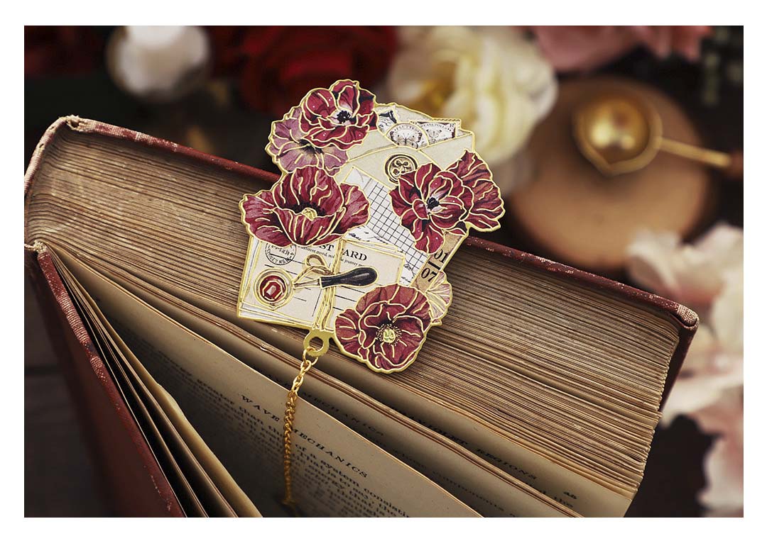 - Marcapáginas metálico con forma y estampado de flores y cartas postales.