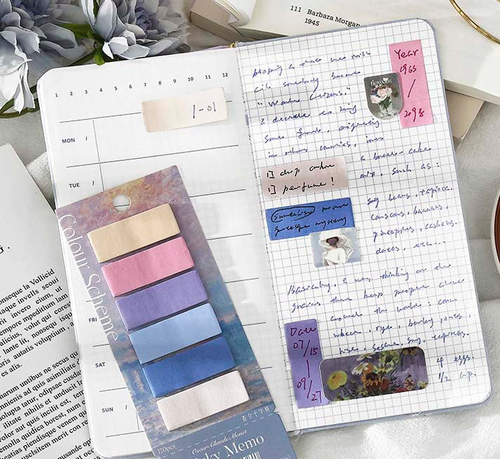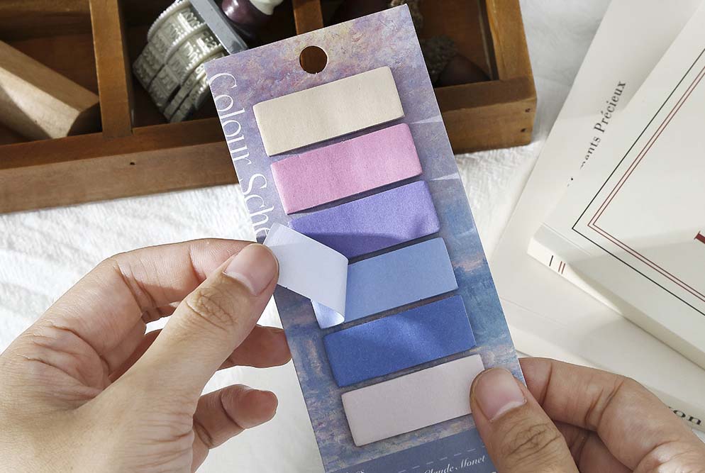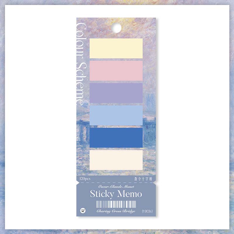 - Notas adhesivas rectangulares de colores inspirados en las obras de Monet.