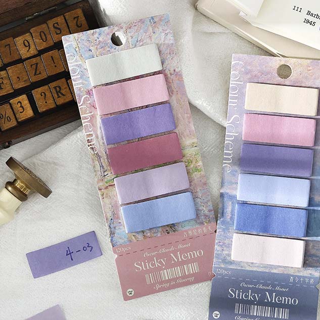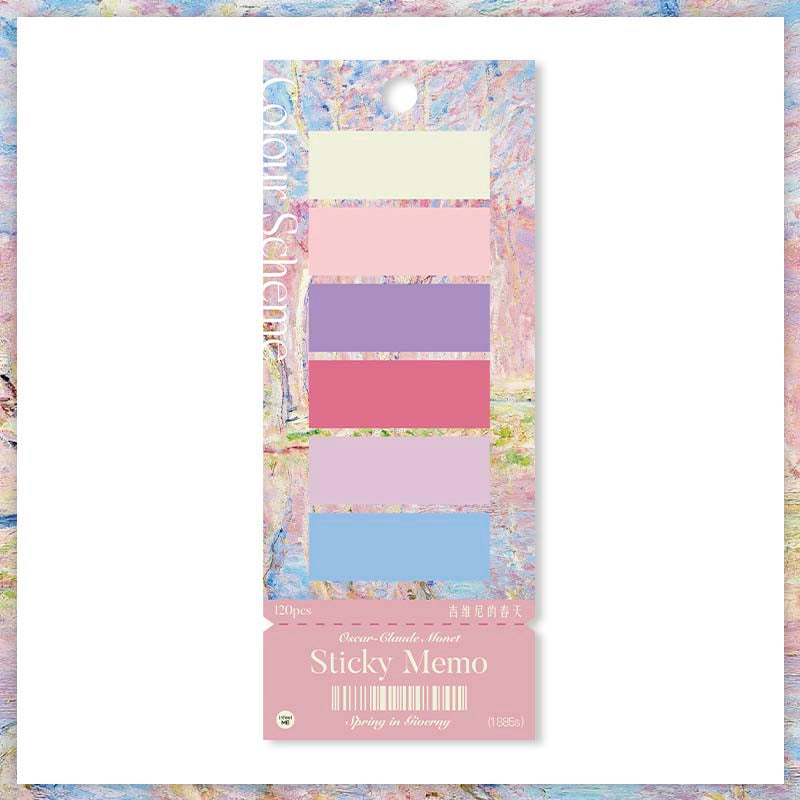 - Notas adhesivas rectangulares de colores inspirados en las obras de Monet.