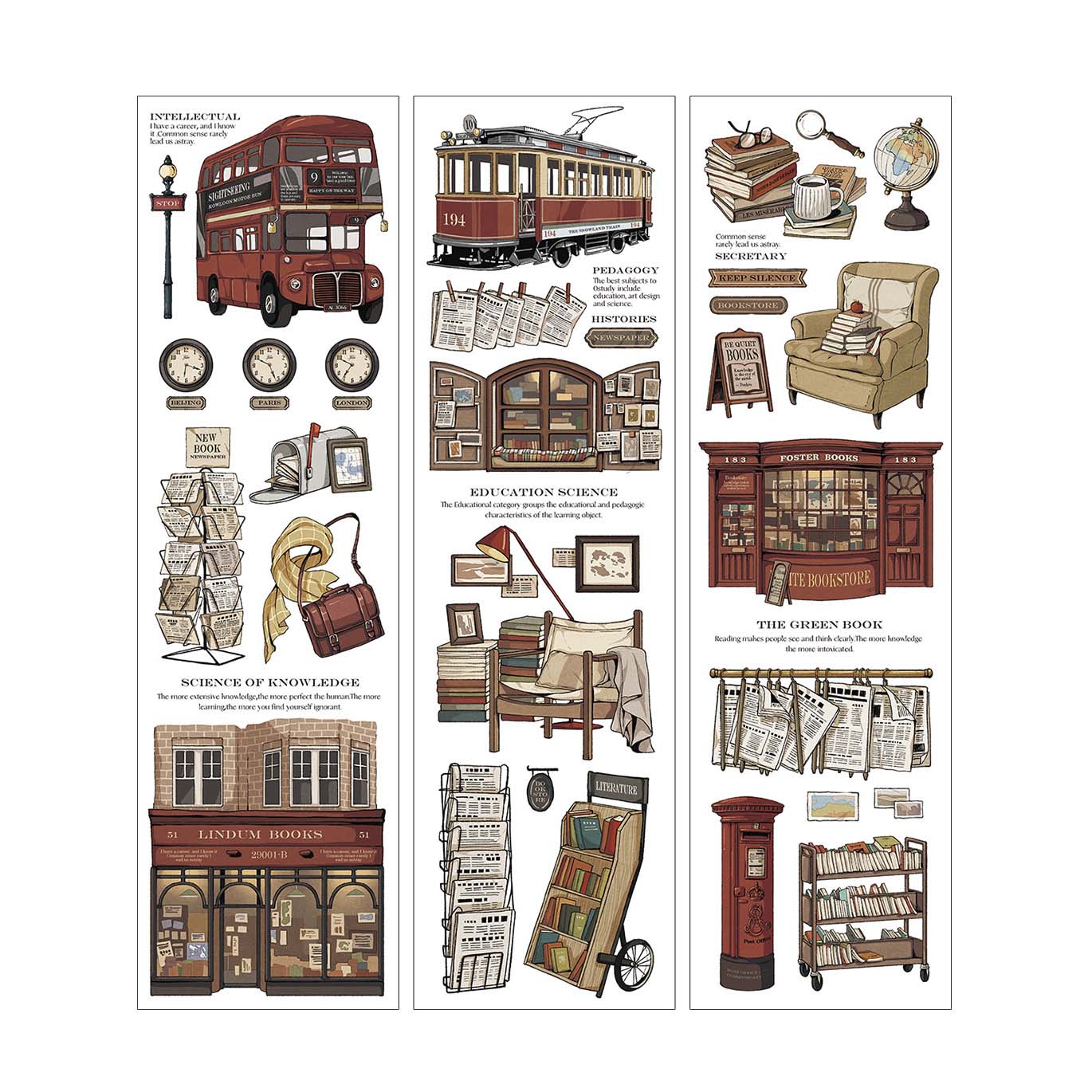 - Set de 6 hojas de pegatinas con estampados ilustrados.