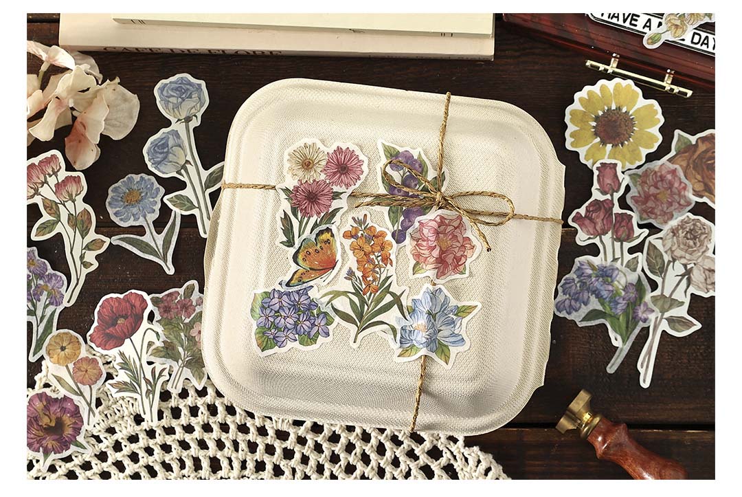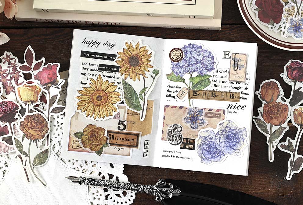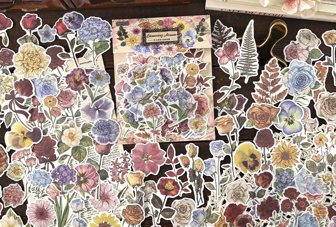 - Pegatinas y papeles decorativas con estampados de flores de estilo vintage.