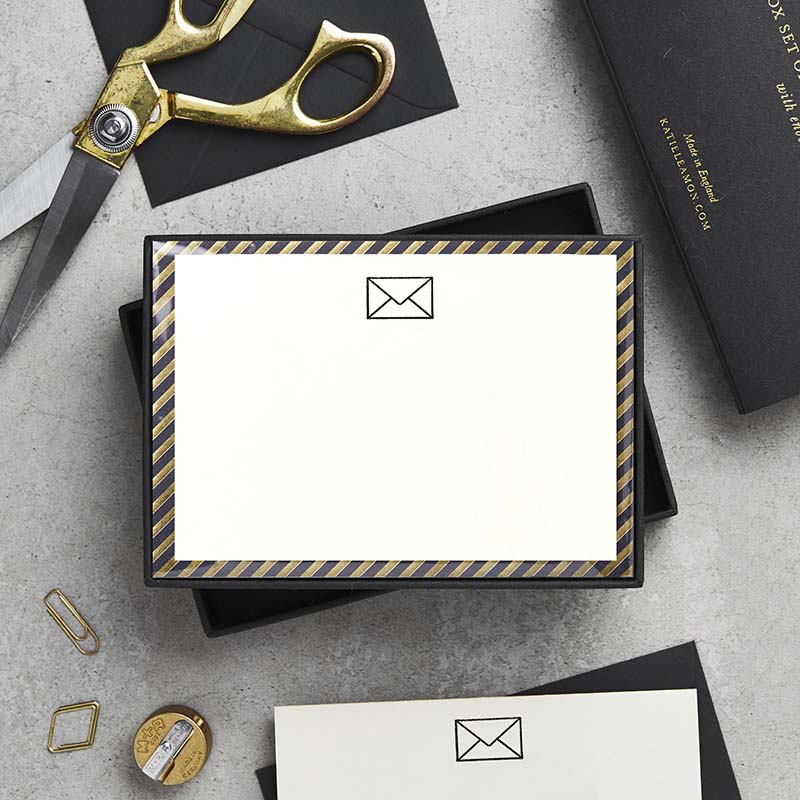 - Includes 1 postcard and 1 black envelope with gold striped print.