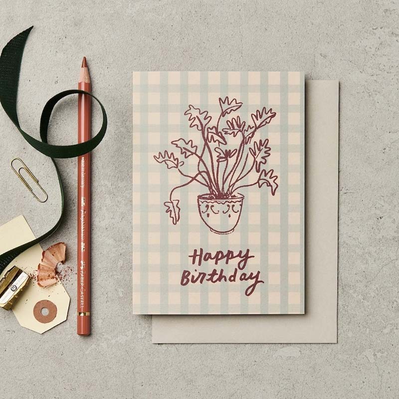 Katie Leamon | Tarjeta de Felicitación Gingham Plant Birthday