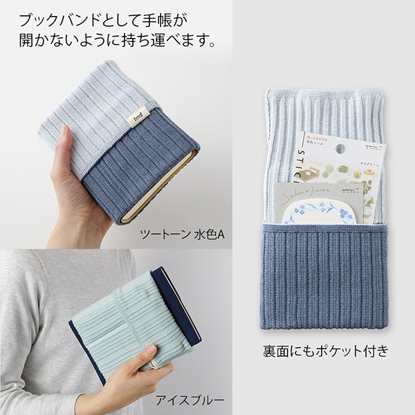 - Una banda de punto que se coloca sobre un cuaderno o agenda de tamaño A6 a B6 para guardar bolígrafos y otros objetos pequeños.