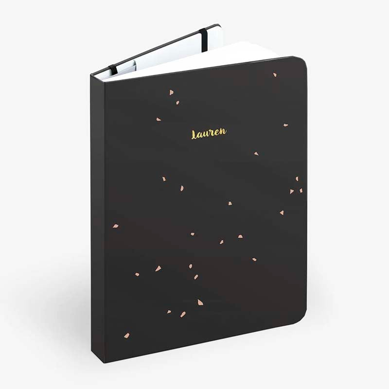 - Portada negra con detalles dorados y cantos redondeados.
