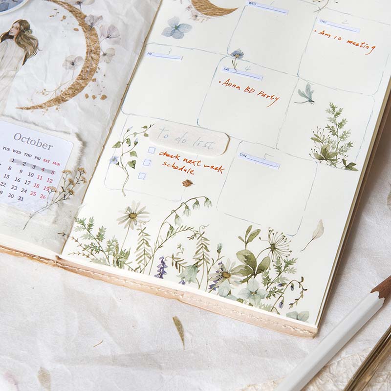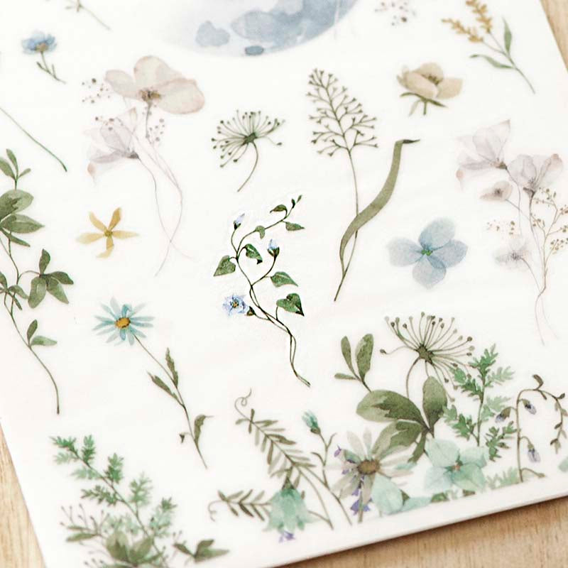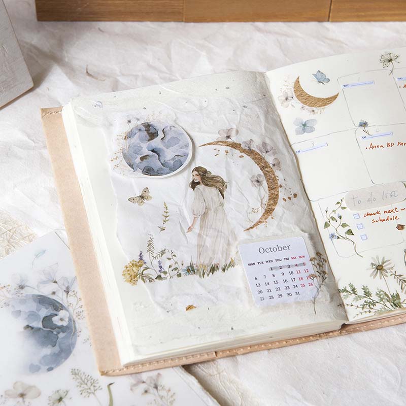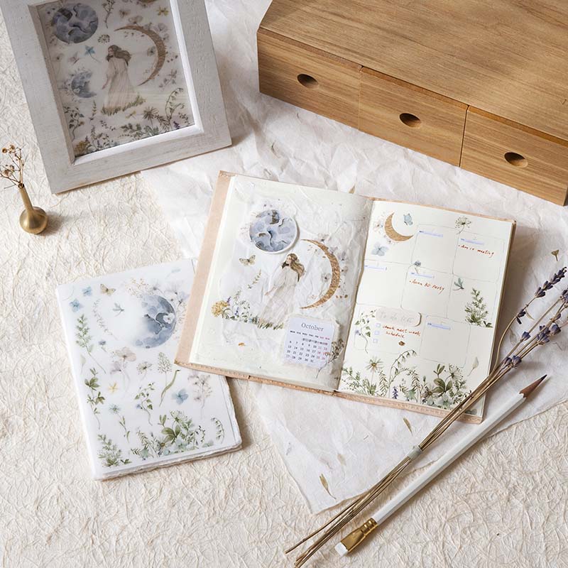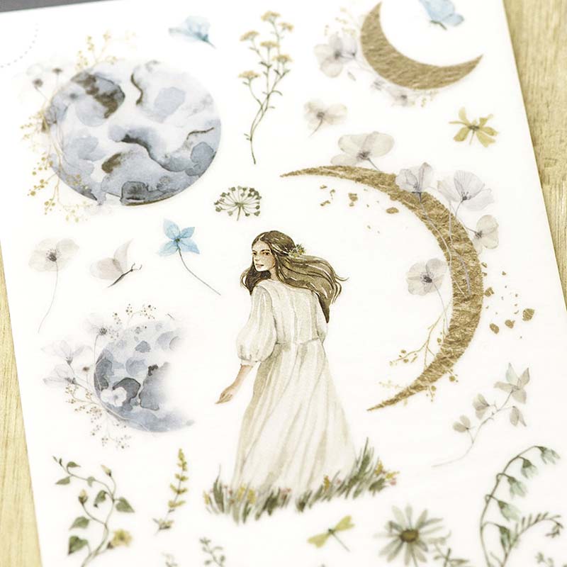 - Pegatinas transferibles con estampado de flores y una chica debajo de la luna.