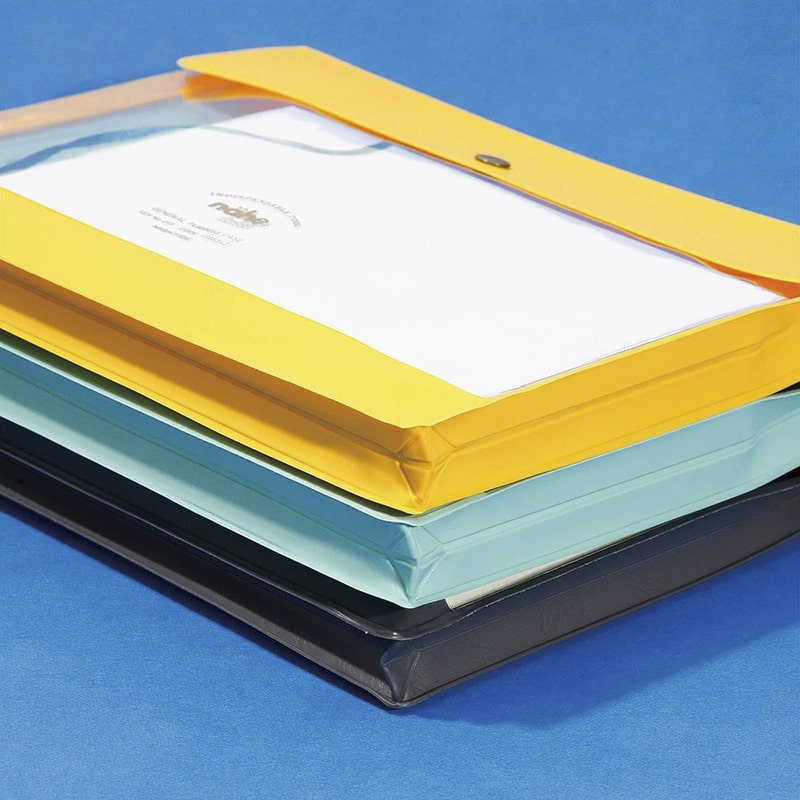 - A5 size plastic portfolio case with interior and exterior compartments.