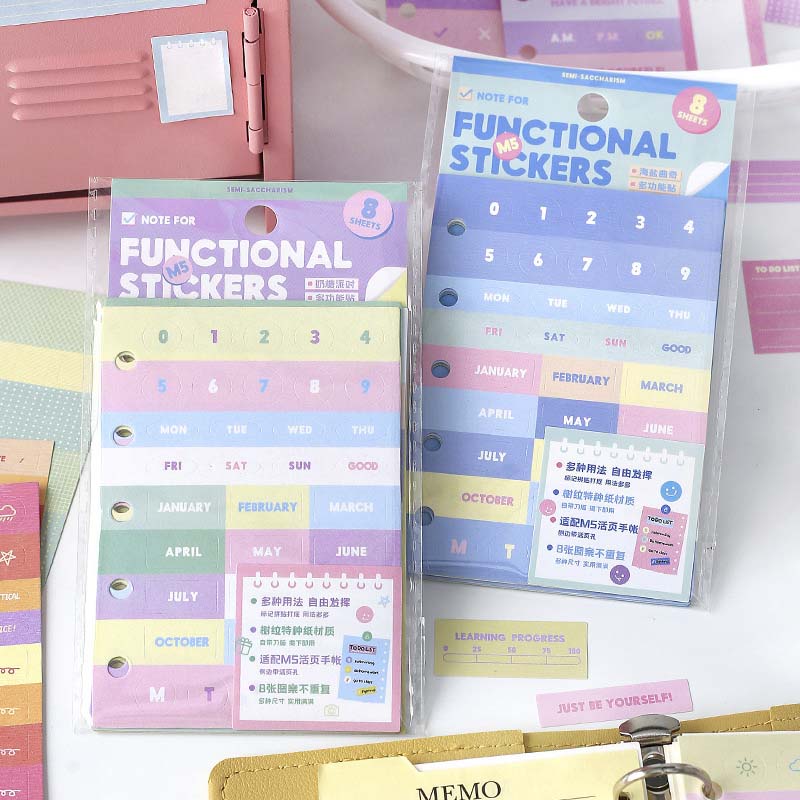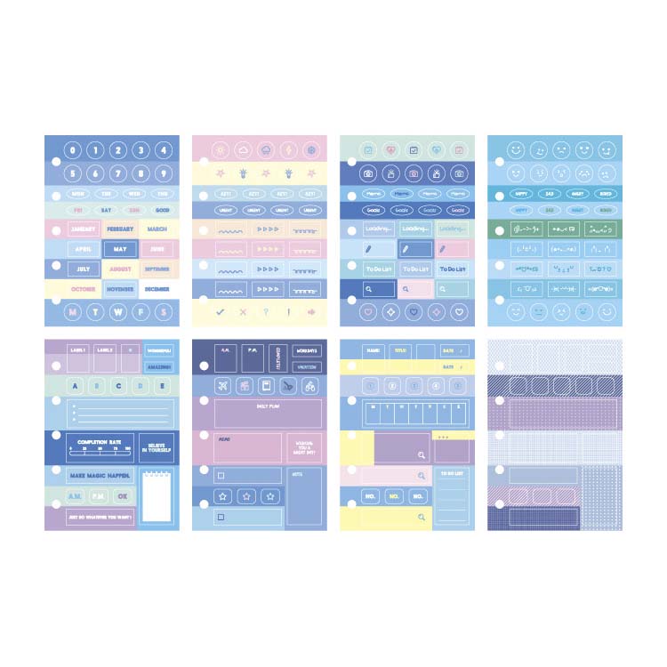 - Set of 8 sheets of stickers with basic and organization prints.