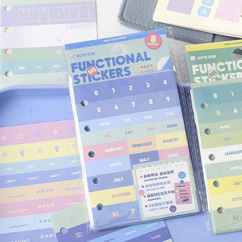 - Sticker sheets have 5 trocured holes on the left side, they can be placed inside rings folders.