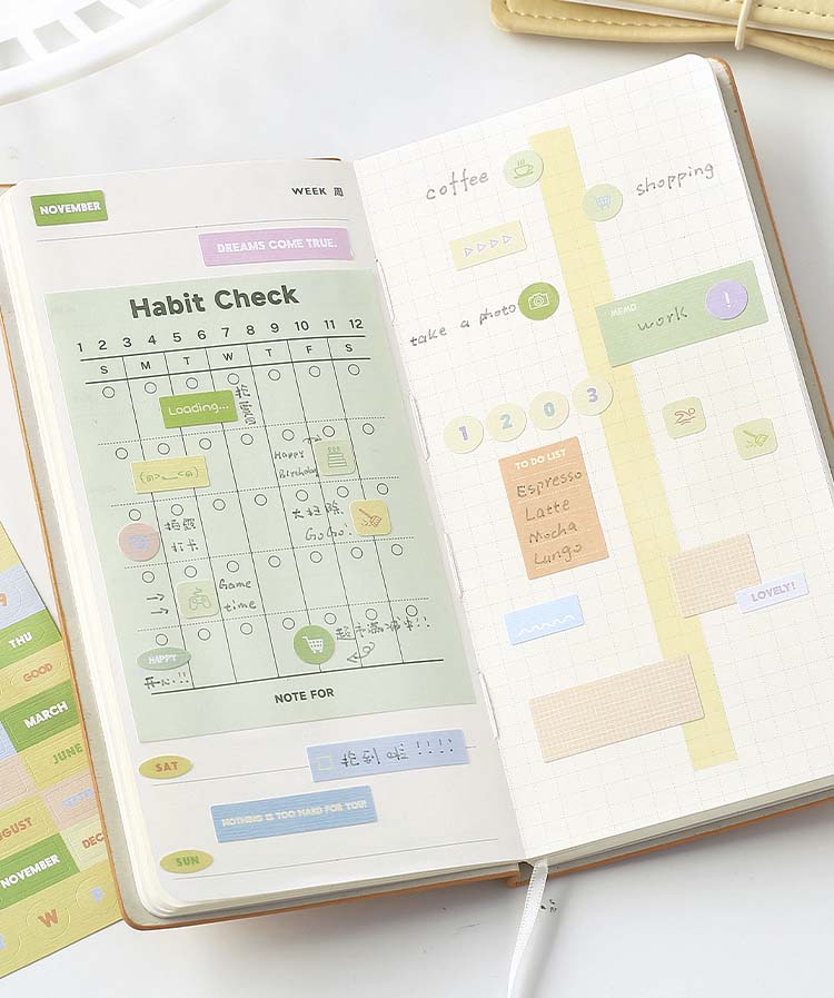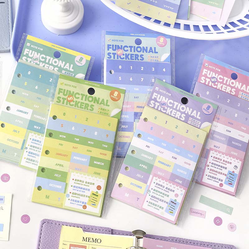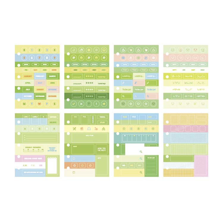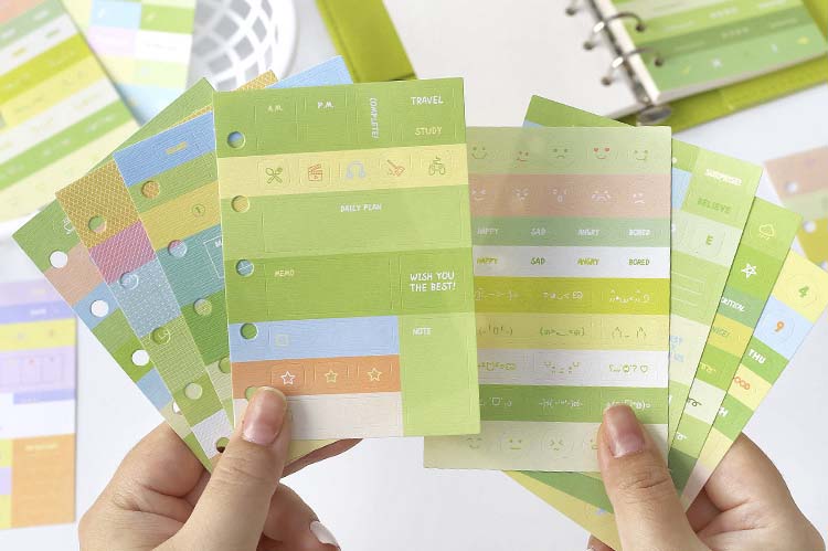 - Sticker sheets have 5 trocured holes on the left side, they can be placed inside rings folders.