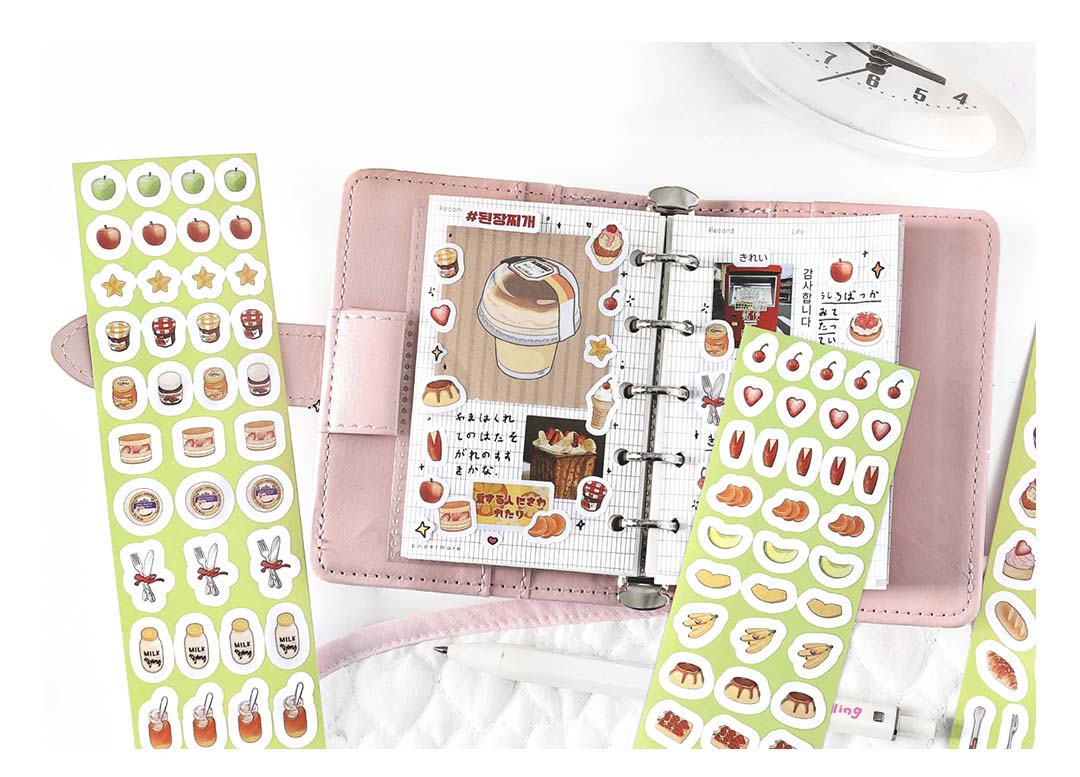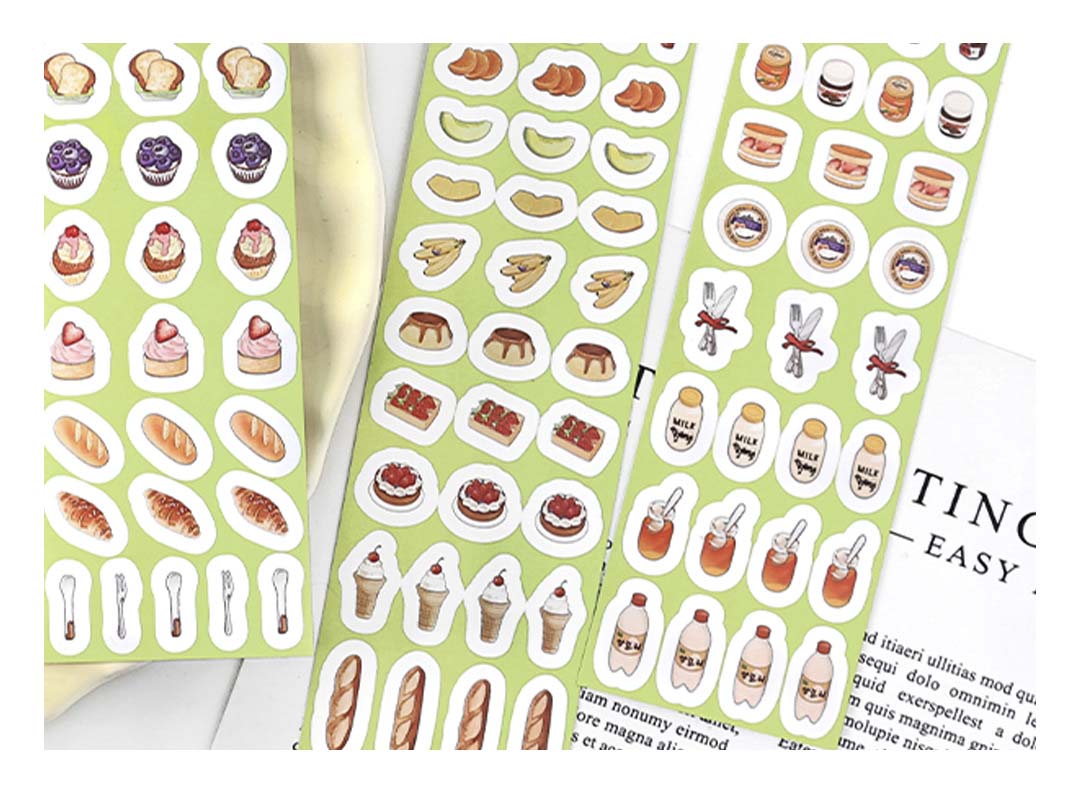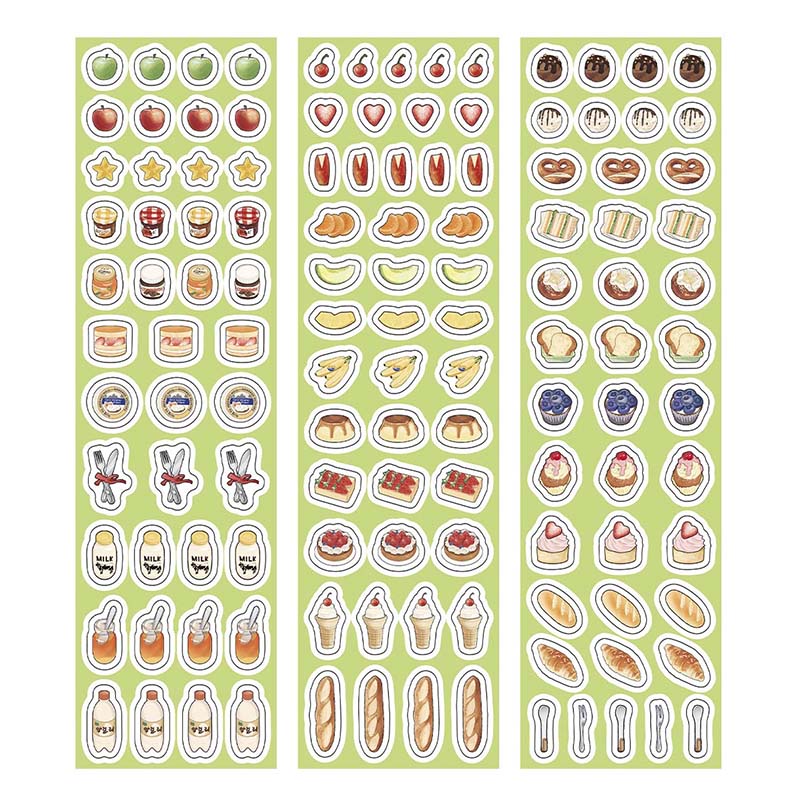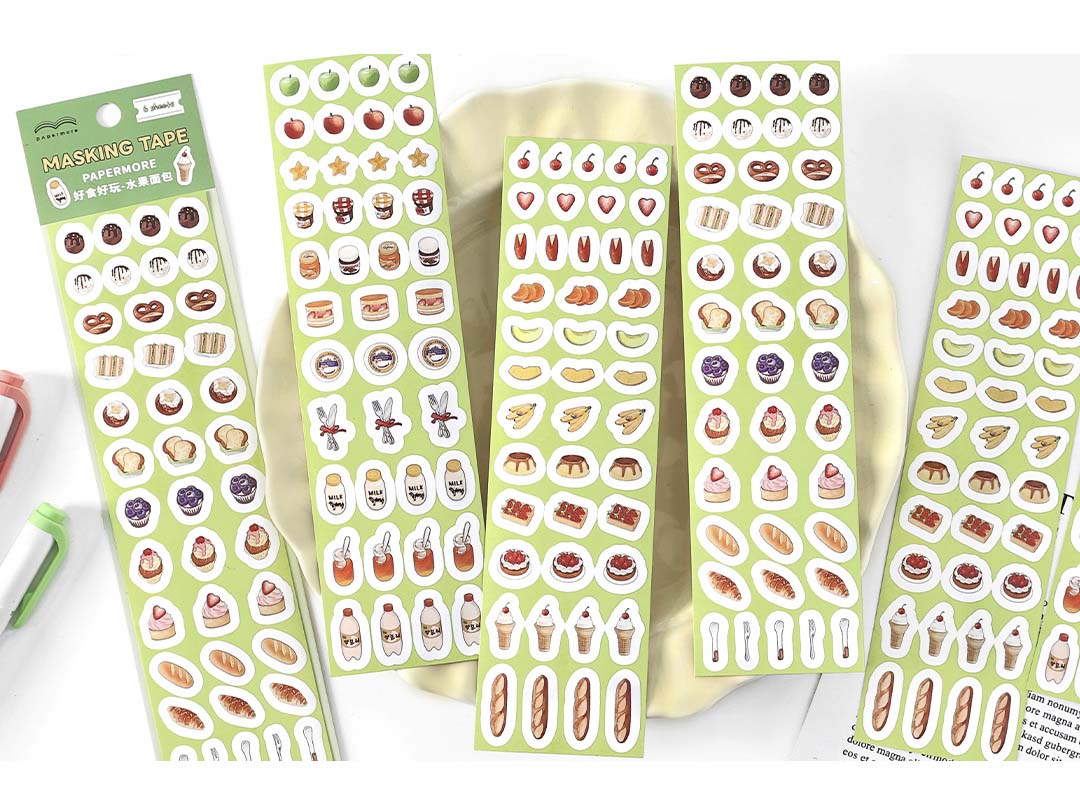 - Set de 3 hojas de pegatinas con estampados de frutas y bollería.