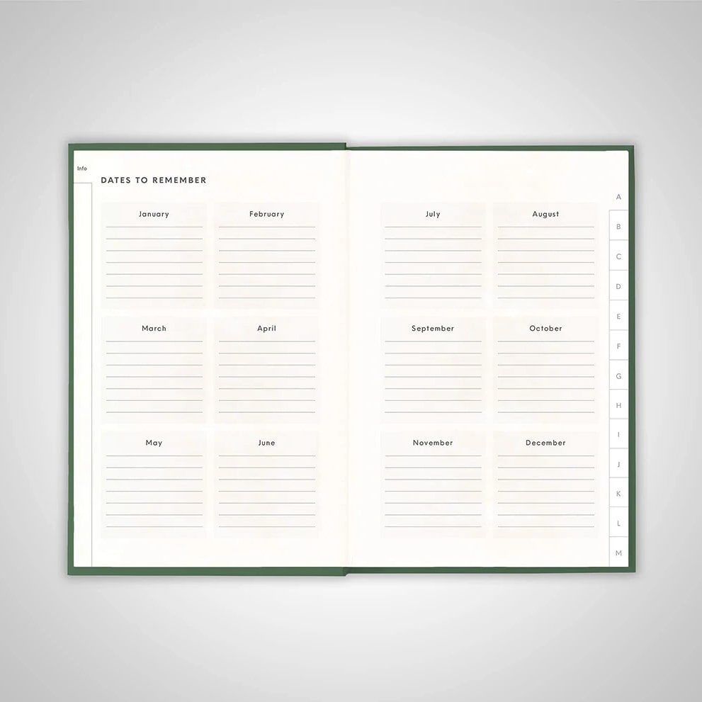 - Includes: contacts section (sorted alphabetically), dates to remember and password tab.