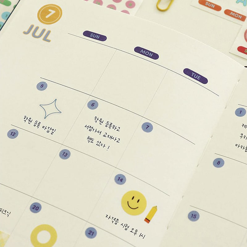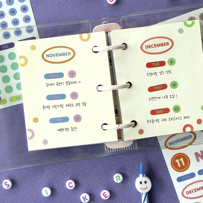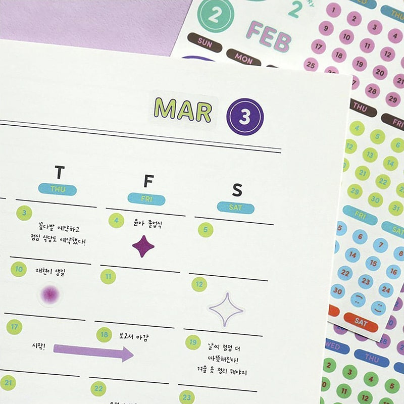 - Incluye 3 hojas de stickers pre-recortados en total de plástico con el fondo transparente, para marcar fechas y días.