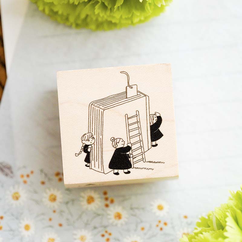 - Sello de goma con la base de madera con estampado de chicas escalando un libro.