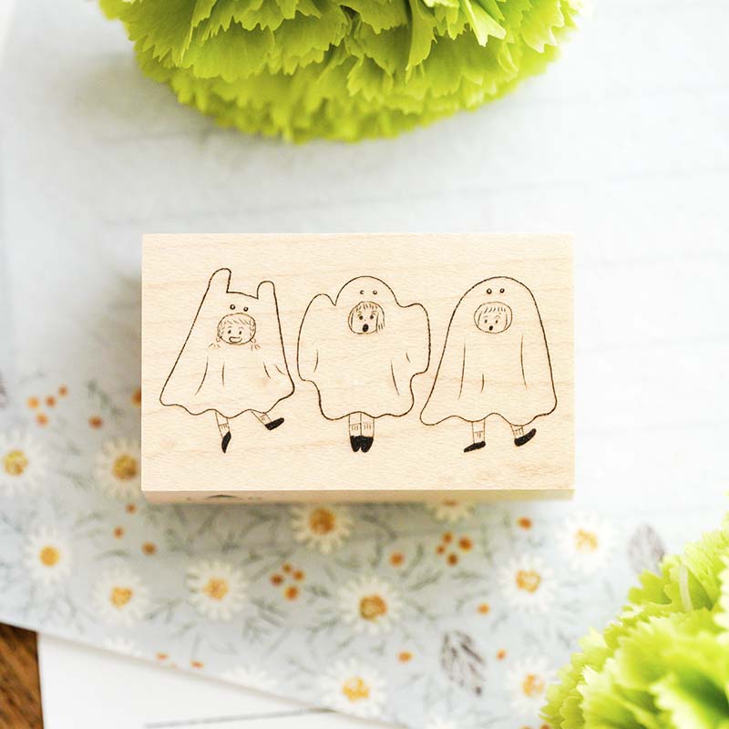 - Sello de goma con la base de madera con estampado de chicas con disfraz de fantasmas.