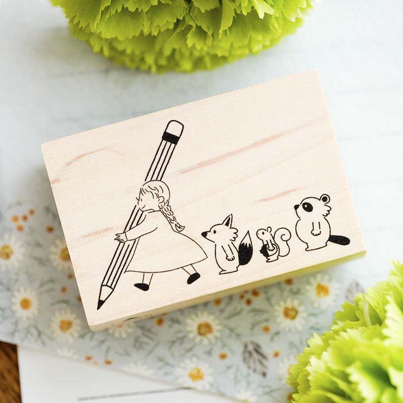 - Sello de goma con la base de madera con estampado de una chica y animales con un lápiz gigante.