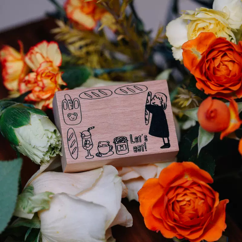 - Rubber stamp with a wooden base and a frame print consisting of a girl and bread.