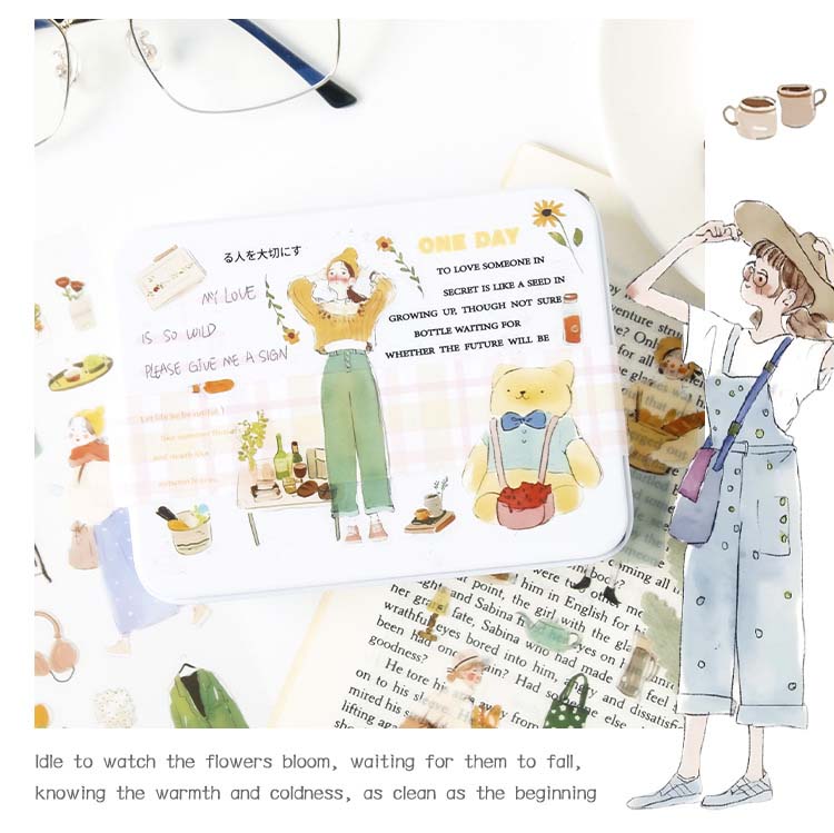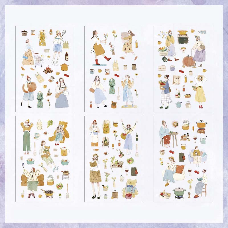 - Set de 6 hojas de pegatinas con estampados de chicas en su vida cotidiana.