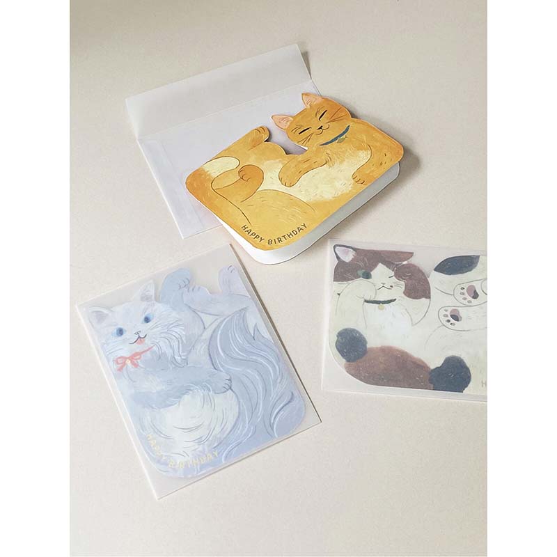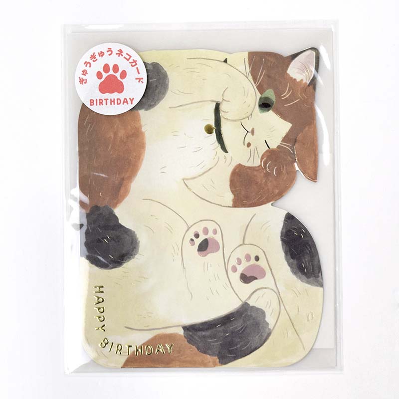 - Tarjeta de felicitación de cumpleaños con estampado de un gato acurrucado.