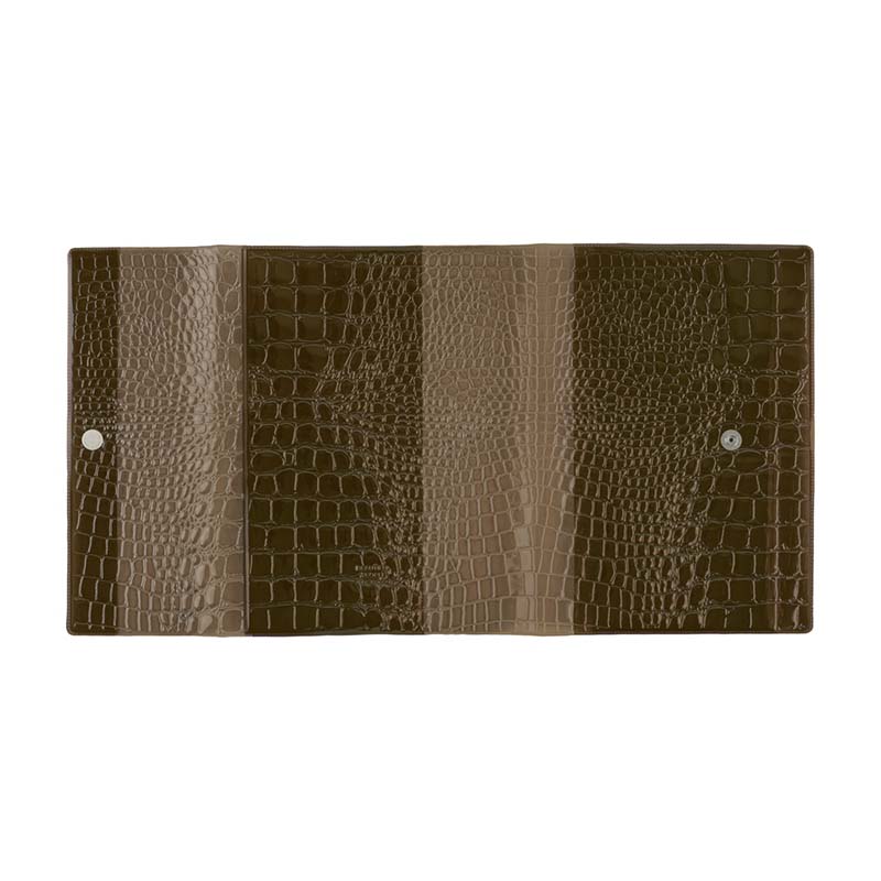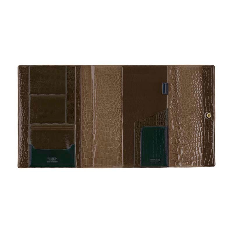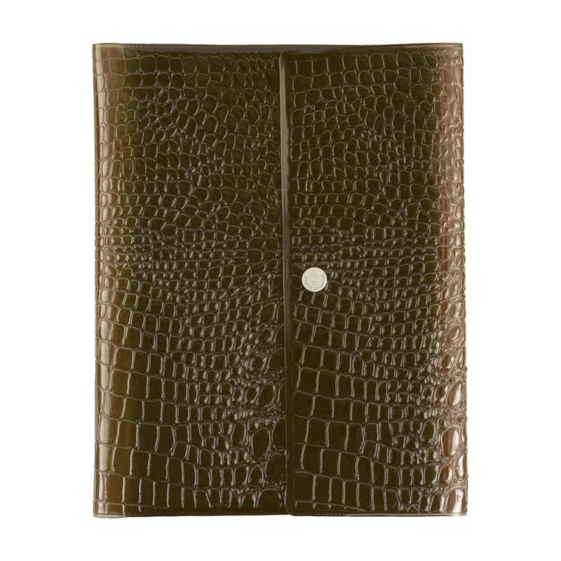 - Esta funda de triple pliegue envuelve la agenda y se cierra con un botón con el logo de la marca.