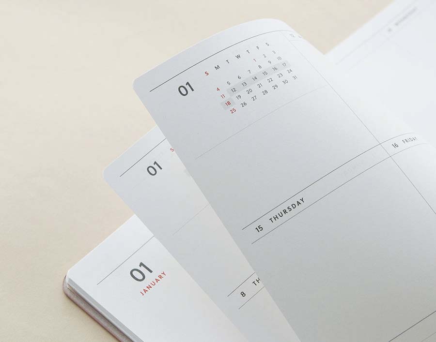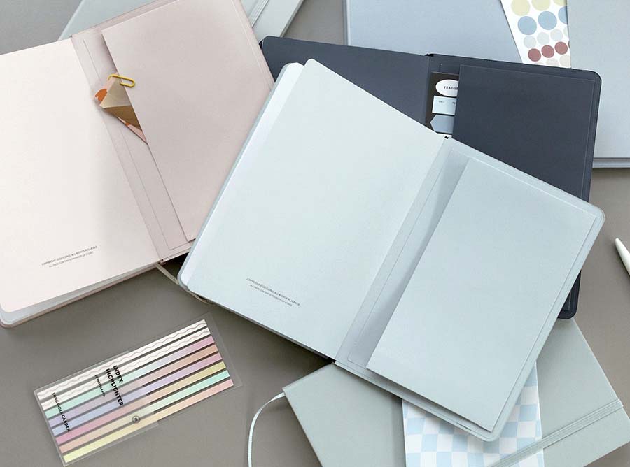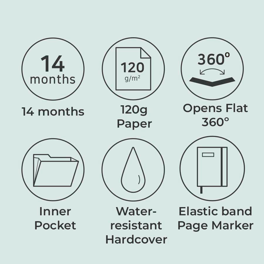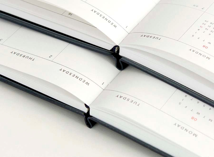 - Encuadernación cosida que permite que la agenda se abra 360 grados con facilidad.
