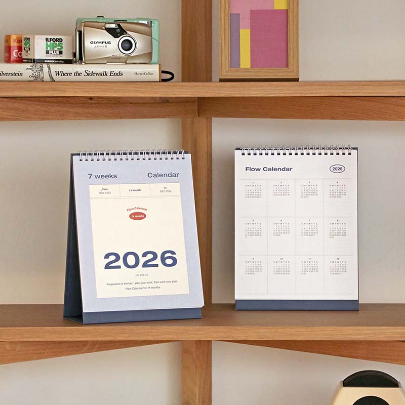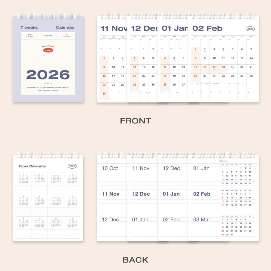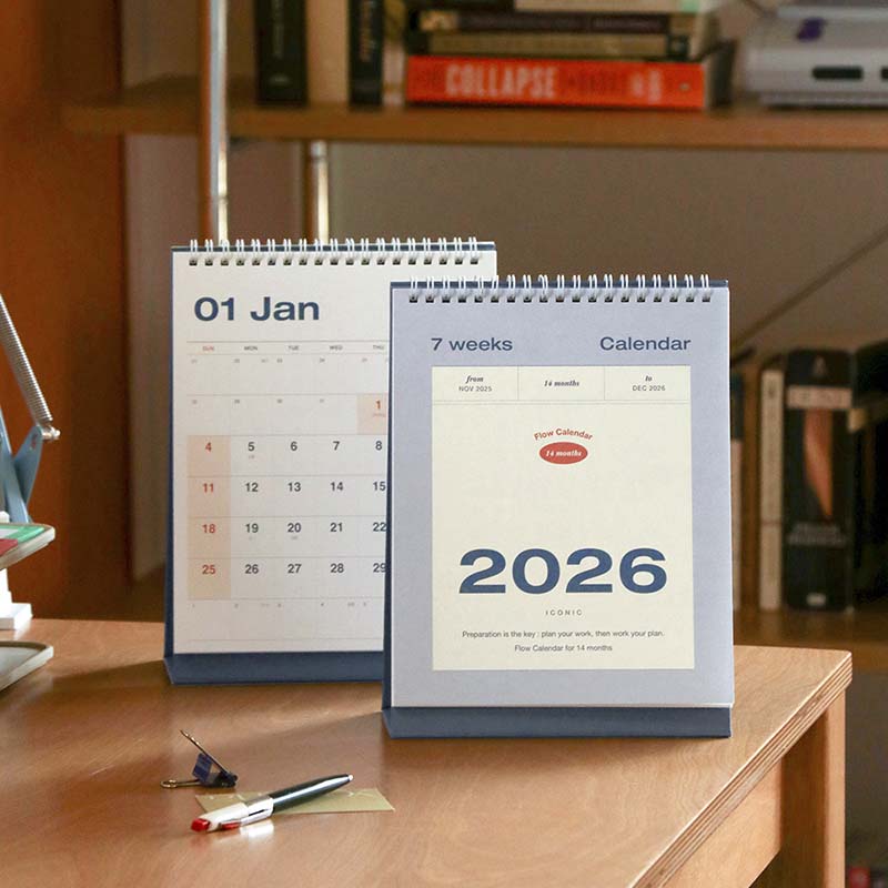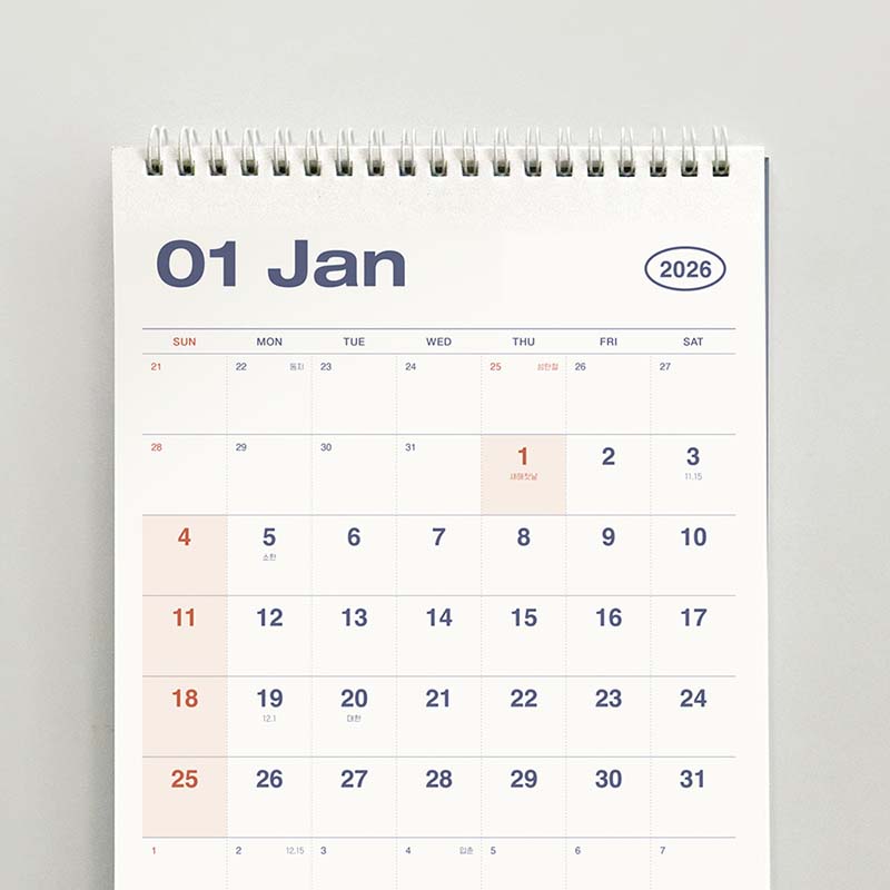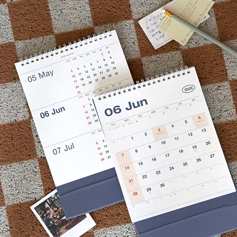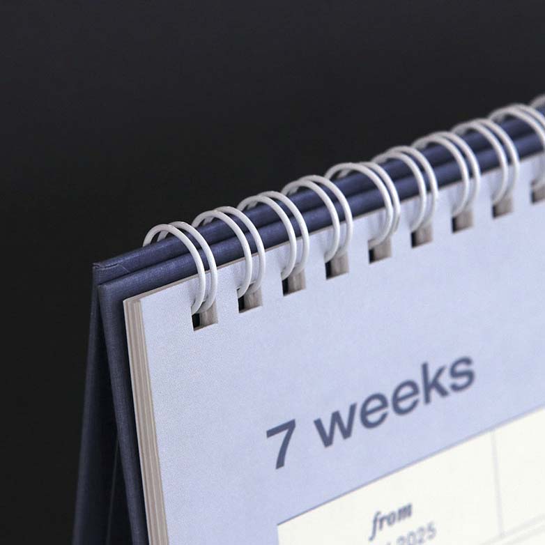 - Por cada mes, son 2 caras con calendarios diferentes (por delante y por detrás): uno con espacio mensual para anotar y que te muestra el calendario del mes pasado y el mes siguiente además del mes actual.