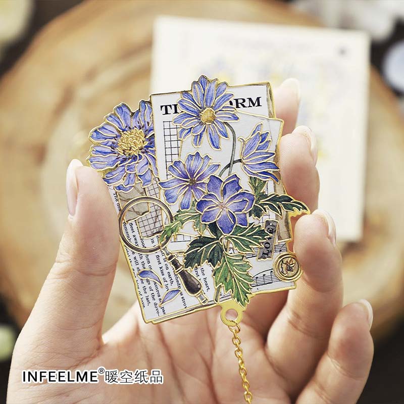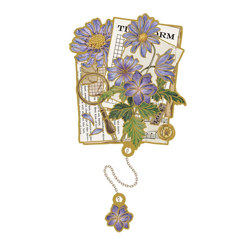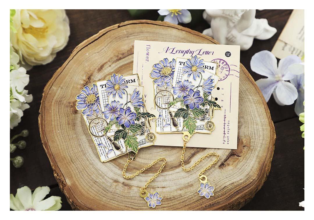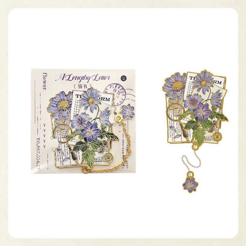 - Marcapáginas metálico con forma y estampado de flores y cartas postales.