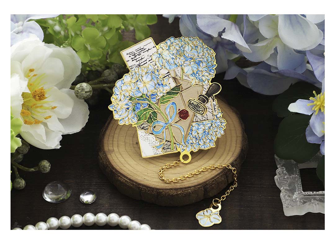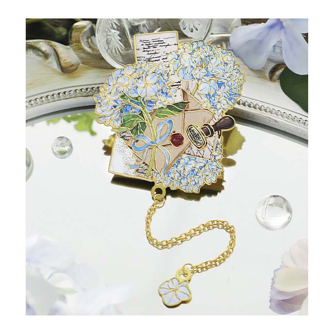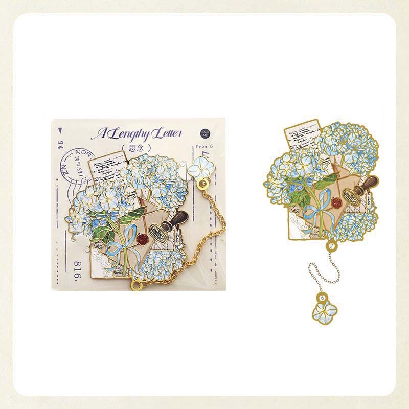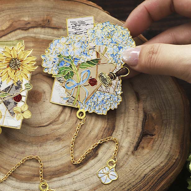 - Marcapáginas metálico con forma y estampado de flores y cartas postales.