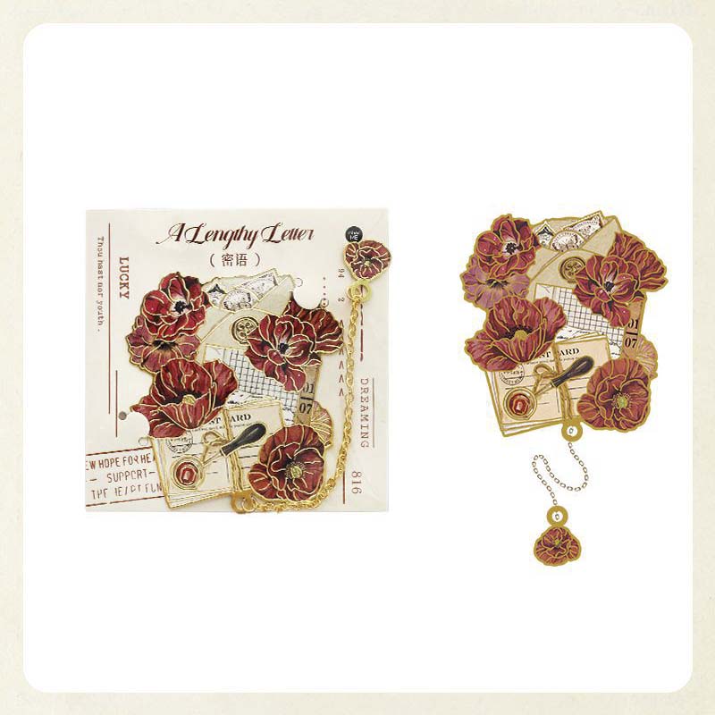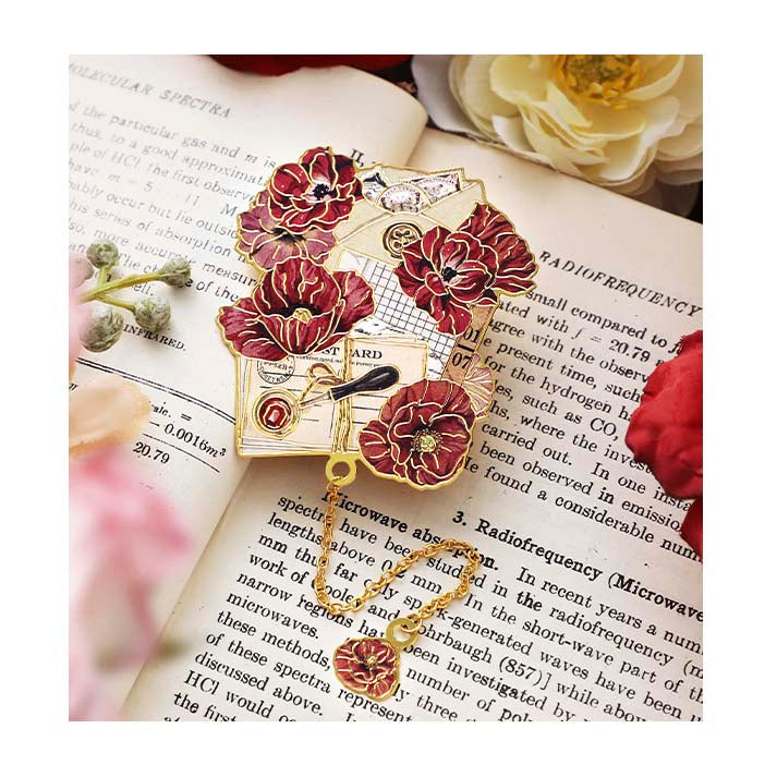 - Marcapáginas metálico con forma y estampado de flores y cartas postales.