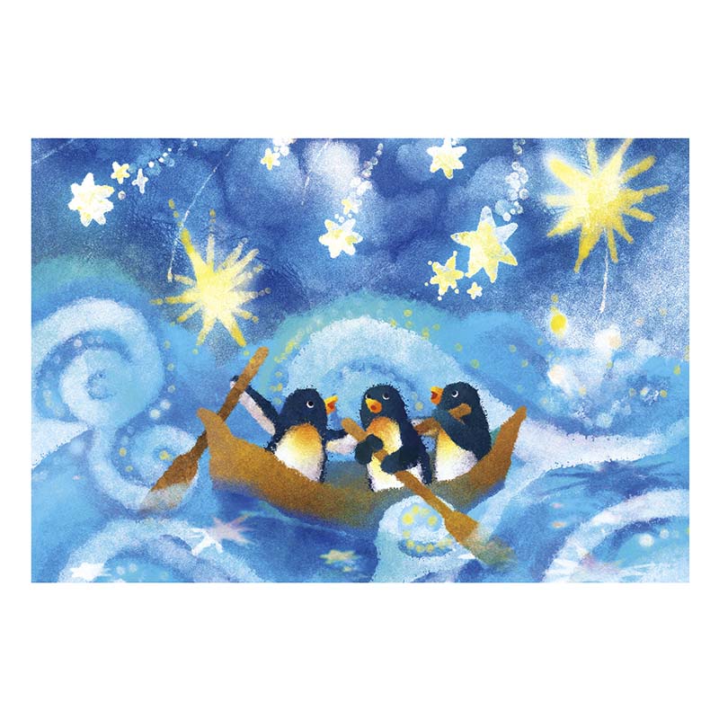 - Postal con ilustración de pingüinos bajos un cielo estrellado.