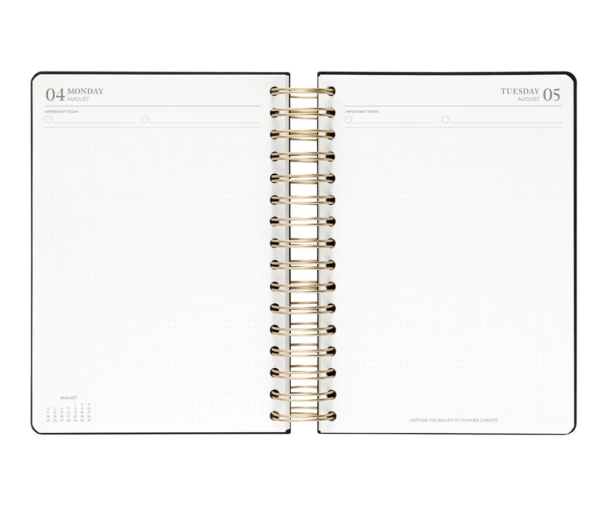 - Encuadernación con anillas tipo o-wire y cierre con banda elástica.