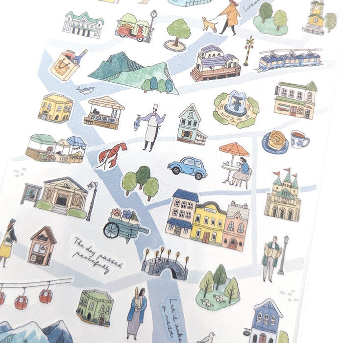 - Pegatinas decorativas con estampados de edificios y elementos urbanos.